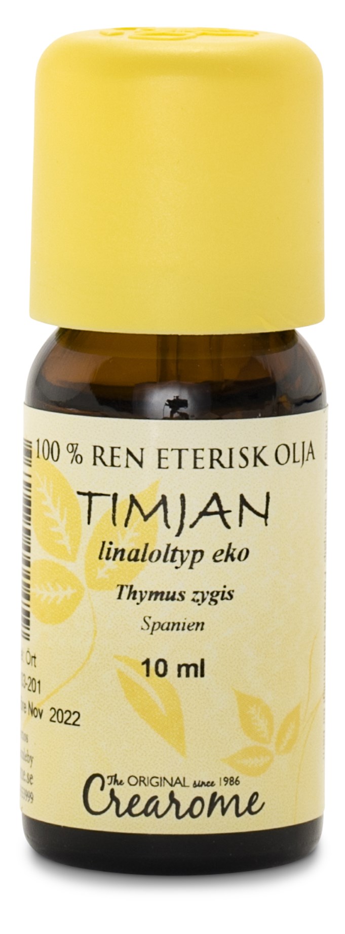 Eterisk Timjanolja är en starkt örtdoftande eterisk olja från Crearome, perfekt för aromaterapi. Eterisk Timjanolja (thyme oil), är välkänd för att verka aktiverande och för luftrening i aromaterapi. Eterisk Timjanolja är en 100 % ren och ekologisk eterisk olja.