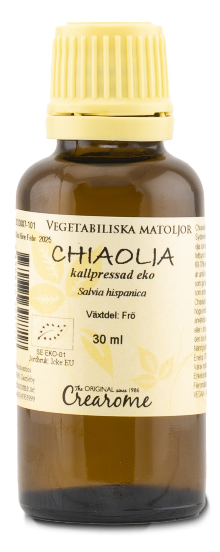 Chiaolja kallpressad Eko från Crearome är en ekologisk mångsidig olja som med fördel kan användas både i matlagning och i hud- och hårvård. Chiaoljan innehåller 60-70% omega-3 och naturliga antioxidanter. Chiaolja passar bra i hår- och hudvård då den är snabbt absorberande och ger näring, samtidigt som den förbättrar hudens cirkulation och elasticitet. Blanda med vegetabiliska oljor och tillsätt E-vitamin eller rosmarin för bästa hållbarhet. Chiaolja kan även användas som matolja då den innehåller höga halter omega-3. Detta gör chiaoljan idealisk för daglig användning i salladsdressingar. Undvik upphettning över 90 grader för att bevara näringsvärdet från omega-3.