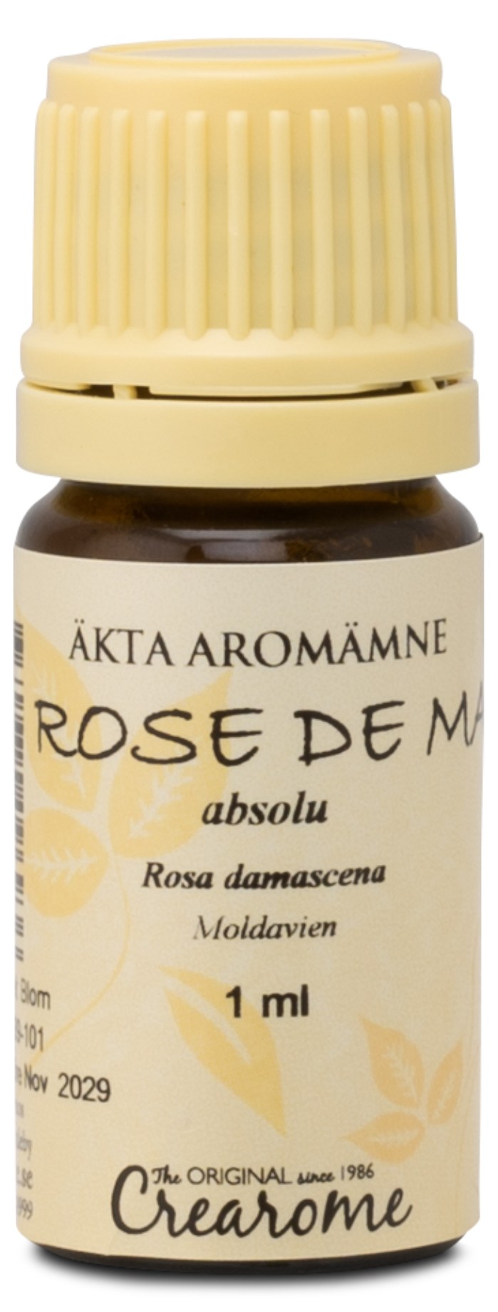 Crearome Rose de Mai Absolu är en underbar olja från damascenerros. Oljan har en exklusiv, varm och avslappnande rosdoft och passar lika bra i aromaterapi som i en ansiktskräm. Damascenerrosor används också ofta i parfymer. Crearome Rose de Mai Absolu består av absoluer, en typ av olja med något större molekyler än eterisk olja vilket ger oljan en tjockare konsistens och rundare doft. Absoluer tas fram genom att ett lösningsmedel tillsätts och sedan filtreras bort, medan eterisk olja destilleras fram helt utan andra ämnen. Absoluerna innehåller dock upp till 95 % samma ingredienser som eterisk olja men kan även innehålla spår av vax och fetter från växten.