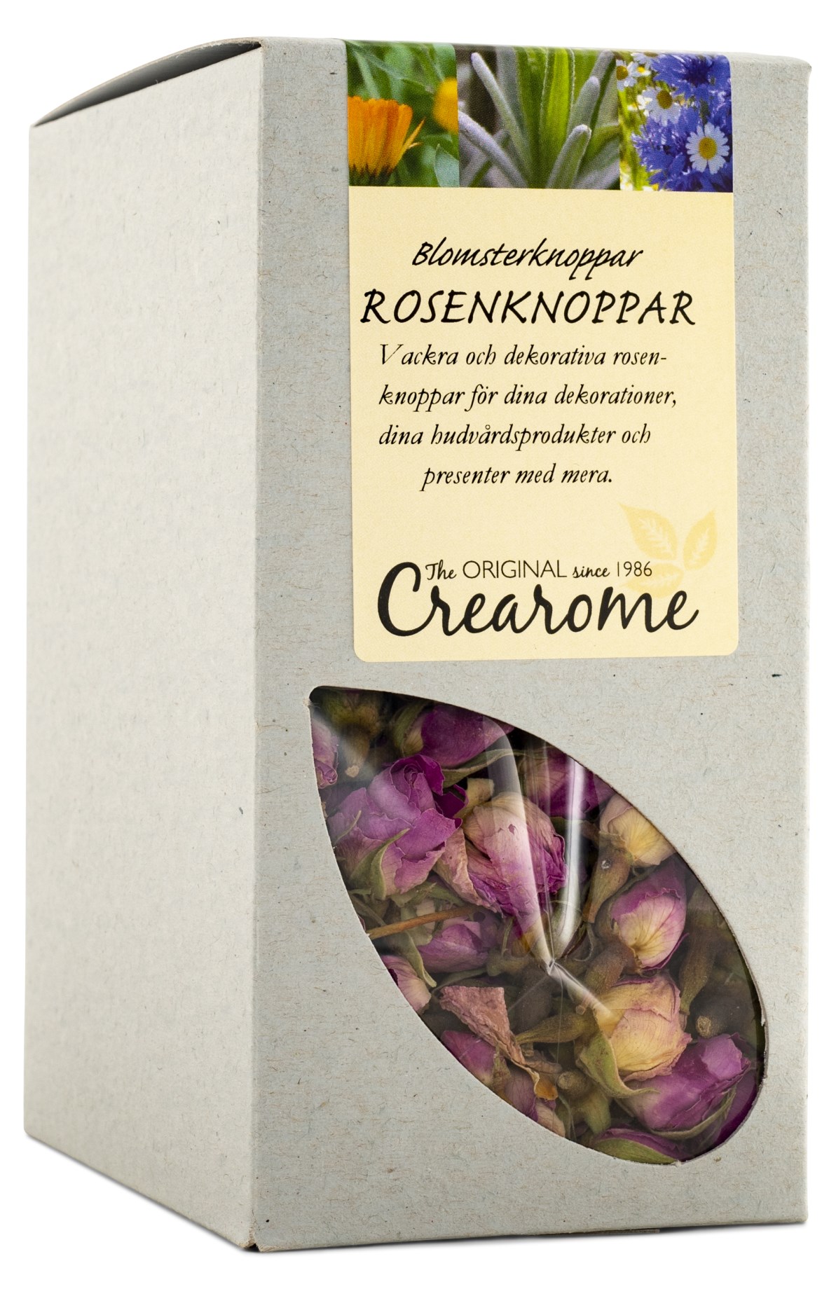 Crearome Rosenknoppar innehåller hela torkade knoppar av rosor (Rosa gallica). Rosenknoppar är vackra och dekorativa, och kan användas både i potpourrier, i badvattnet och som dekoration i örtteer. Du kan även göra ett avkok på knopparna för att ta del av den eteriska oljan och garvämnena. Rosenolja har en renande och sammandragande effekt och lämpar sig därför i ansiktsprodukter vid t.ex. pormaskar.