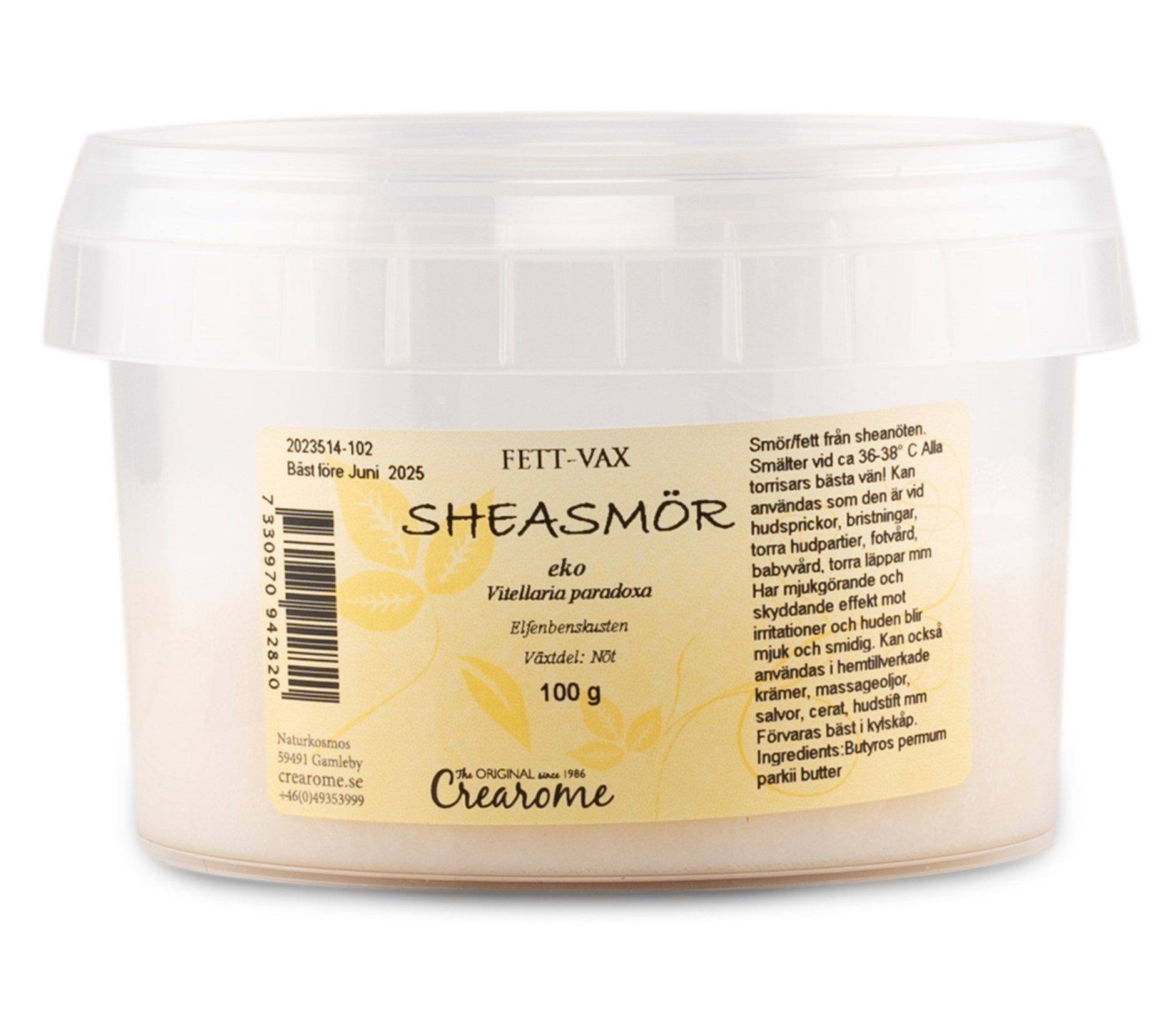 Rädda torra händer och hudsprickor med Crearome Sheasmör Ekologiskt. Det ekologiska sheasmöret utvinns från sheanötter och innehåller en näringsrik fettsyrasammansättning. De olika fettsyrorna i smöret har mjukgörande egenskaper och därför är sheasmör en populär produkt inom skönhet och hud- och hårvård, och återfinns ofta i hudkrämer och salvor. Crearome Sheasmör Ekologiskt mjukgör torra partier och skyddar huden mot irritationer till såväl hy som hårbotten.
