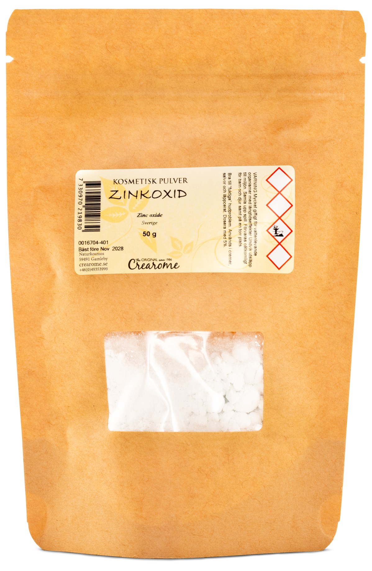 Crearome Zinkoxid Pulver är ett rent pulver med zinkoxid, helt fritt från nanopartiklar. Zinkoxid är ett vitt pigment som är vanligt i mineralbaserade solskyddsprodukter tack vare sitt skydd mot både UVA och UVB. Det är antibakteriellt, sammandragande och lugnande, och passar därför bra i egengjorda hudvårdsprodukter som t.ex. salvor och krämer. Den uttorkande effekten gör den lämplig att använda vid exempelvis irriterad hud, munsår, vätskande eksem, blöjeksem och andra rodnader på huden. Dosera ca 5 %.