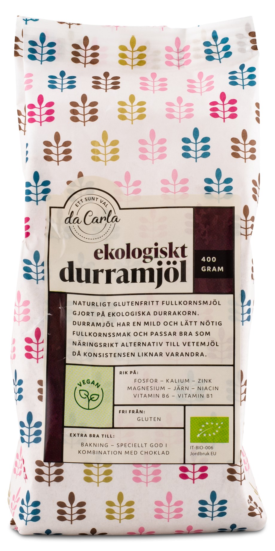da Carla Durramjöl EKO är ett glutenfritt fullkornsmjöl. Durramjöl kommer ursprungligen från Afrika men odlas idag över hela världen. Mjölet är både rikt på mineraler och fiber och har en något nötig smak. Durramjöl passar bra till bakning i degar med jäst och ger en god fullkornssmak. da Carla Durramjöl EKO kan även användas i kakor och ljusa bakverk tack vare att det är väldigt likt vanligt mjöl i konsistensen. Så testa att byta ut dina mjölsorter mot durramjöl redan idag, choklad och durra är en riktigt god kombination. Letar du efter andra mjölsorter finns även da Carla Tapiokamjöl och da Carla Hampamjöl.