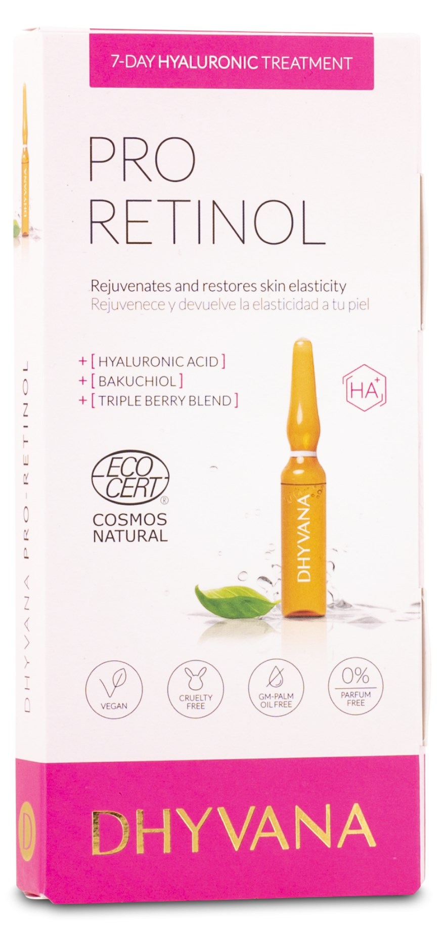 Dhyvana Ampuller PRO RETINOL är en hyaluronsyre-ampull med bakuchiol, ett naturligt alternativ till syntetisk retinol. Även med extrakt från Ginkgo Biloba, röda druvor och acaibönor. Tillsammans föryngrar och regenererar de huden och tar bort imperfektioner - helt enkelt kraftfull anti-aging utan negativa bieffekter! Med en fillereffekt på köpet. Perfekt för dig med åldrande eller skadad hud. Använd som intensivkur eller för ett långsiktigt resultat.