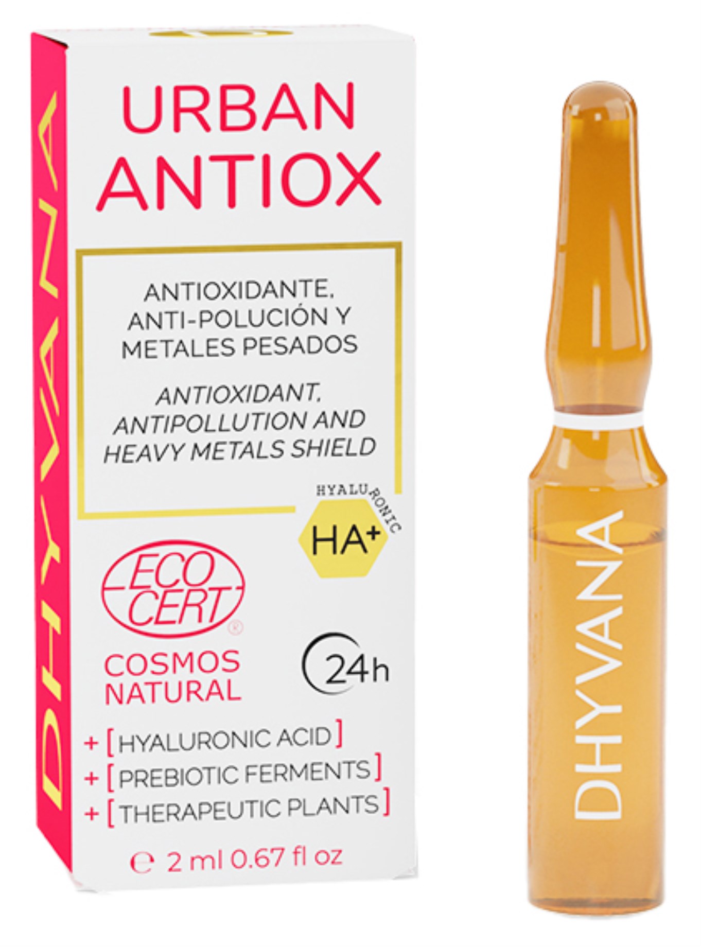 Dhyvana Ampuller URBAN ANTIOX är en hyaluronsyre-ampull med antioxidativa egenskaper - perfekt för dig med stressad hud som har utsatts för föroreningar! Med piachia prebiotika samt vårdande extrakt från sallatspikblad, drakblod, vattenhyssop (bacopa), moringa och lapsana. Syresätter huden och skyddar mot föroreningar. Använd som intensivkur eller för ett långsiktigt resultat!