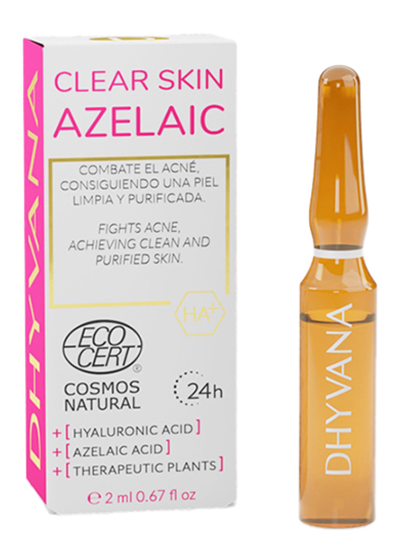 Dhyvana Clear Skin Azelaic innehåller ampuller med ultrakoncentrerad hyaluronsyra, azelainsyra, bärnstenssyra och extrakt från magnolia och lakrits. De går att använda som intensivkur eller för långvarigt resultat. De verksamma ämnena jobbar för att motverka blemmor och aknedrabbad hud. Filler-effekten motverkar fina rynkor och lindrar inflammation i talgkörtlarna.