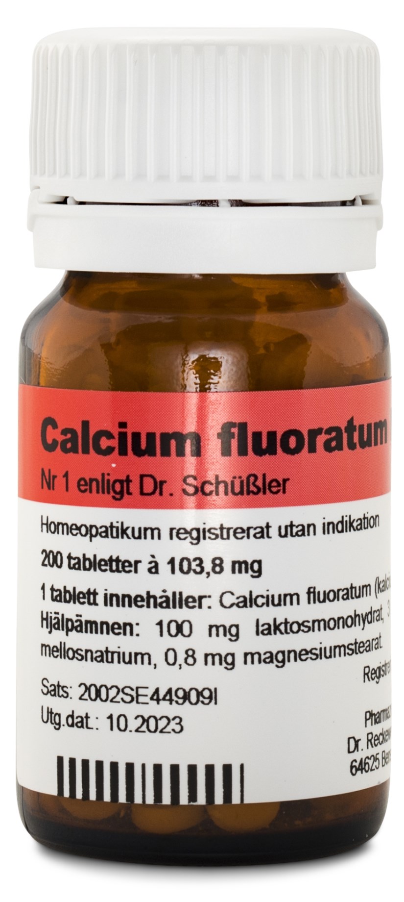 Dr. Reckeweg Cellsalt Nr 1 Calcium fluoratum D6 är ett homeopatiskt medel som bland annat används för funktioner i bindväv, senor, leder och hud. Dr. Reckeweg Cellsalt Nr 1 Calcium fluoratum D6 innehåller den kemiska föreningen kalciumflourid av kalcium och fluor. Grundämnet kalcium finns naturligt i kroppen och bidrar exempelvis till uppbyggnaden av ben och tänder. Tabletterna är kontrollerade och godkända av Läkemedelsverket.