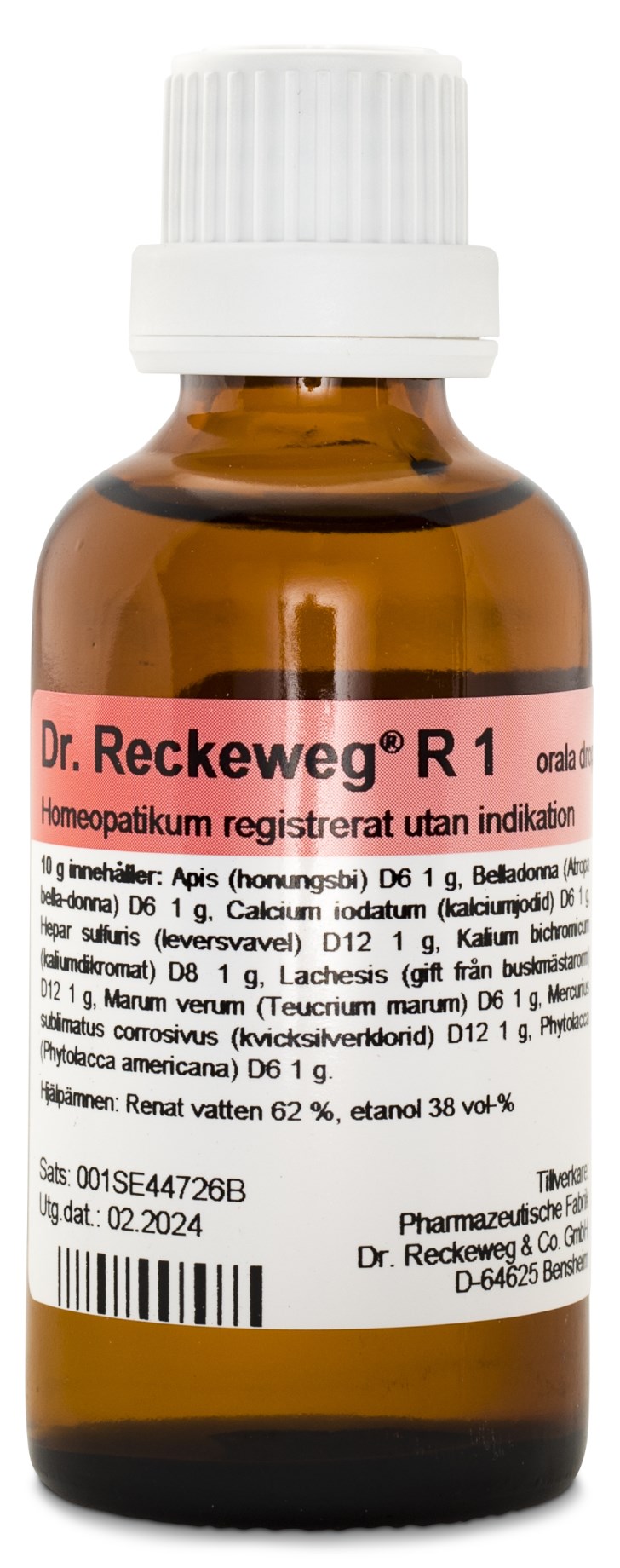 Dr. Reckeweg R1 är ett homeopatiskt medel som är kontrollerat och godkänt av Läkemedelsverket. De orala dropparna kan tas som de är eller blandas ut i en matsked vatten. Dr. Reckeweg R1 innehåller ett flertal olika ingredienser, däribland Atropa Belladonna, Phytolacca Americana och Teuricum Marum.