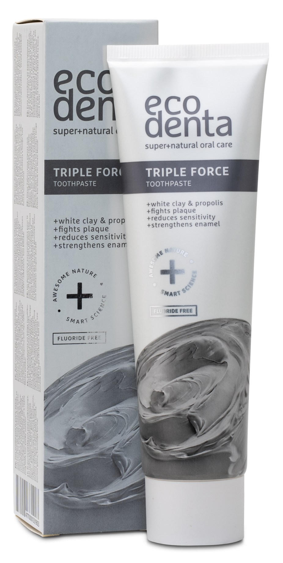 Triple Force Tandkräm från Ecodenta passar munnens känsliga områden extra bra! Innehåller vit lera och propolis som bidrar till att bekämpa plack, stärka emaljen och att minska tändernas och tandköttets känslighet. Så mycket som 98 procent av innehållet är av naturligt ursprung.