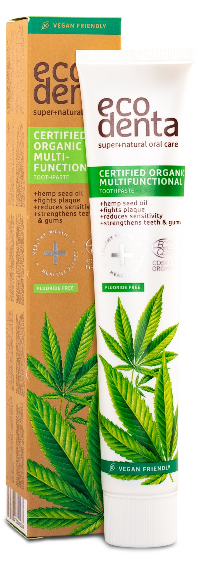 Ecodenta Organic Line Multifunctional Toothpaste är en naturlig och fluorfri tandkräm. Den innehåller hampaolja, matcha, kaliumcitrat, aloe vera och pepparmyntsolja som hjälper till att bekämpa plackbildning samt lugnar och tar hand om dina tänder och tandkött.