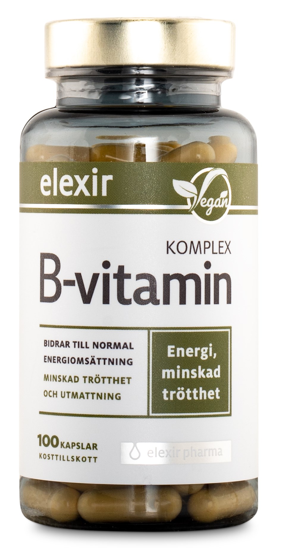 Med Elexir Pharma B-vitamin Komplex får du i dig dagsbehovet av alla B-vitaminer som du behöver. Vitamin B7 eller Biotin som den även kallas är viktig för huden och hårets normala kvalitet. B-vitaminer har även en viktig del i kroppens energiomsättning och vissa B-vitamin bidrar även till hormonreglering och till minskad trötthet. När vi stressar eller ökar vår fysiska aktivitet så förbrukar vi extra mycket B-vitaminer. Elexir Pharma B-vitamin Komplex är fria från konserveringsmedel och artificiella ämnen, kapslarna är även vegetabiliska. Komplettera din kost med B-vitaminer om du vill säkerställa ditt intag och speciellt om du äter en ensidig kost eller om du är vegan eller vegetarian.