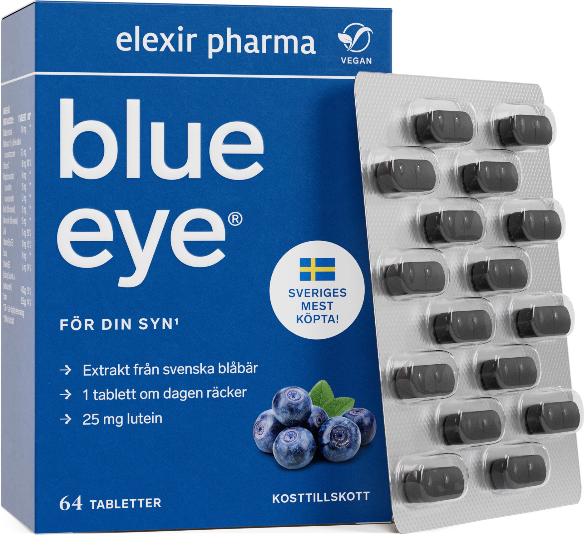 Elexir Pharma Blue Eye är tabletter med blåbärsextrakt som är naturligt rikt på ämnet lutein. Lutein återfinns bland annat i ögats näthinna, men ögat kan inte bilda lutein själv utan vi måste tillföra det via kosten kontinuerligt. Även lutein från ringblomma är tillsatt i produkten för att ge extra mycket lutein i en tablett. Blue Eye kan användas som ett dagligt tillskott för alla som vill säkerställa sitt intag av dessa näringsämnen, inte minst bland personer 50+. Rekommenderat intag är en tablett dagligen.