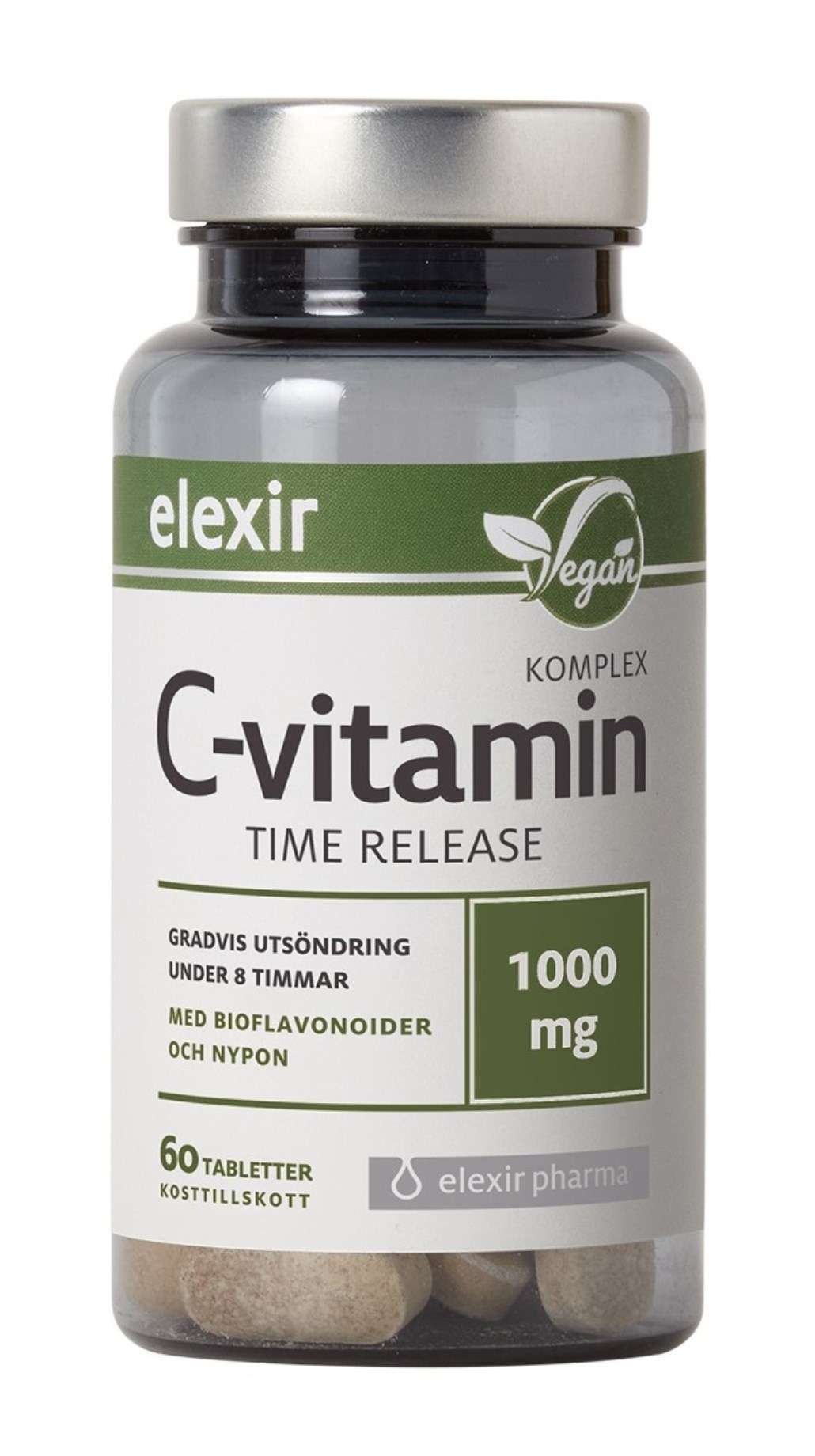 C-Vitamin Komplex Time Release från Elexir Pharma är ett tillskott med 1000 mg mikrogranulerat C-vitamin. Tillskottet ger en utsöndring av C-vitamin i upp till så mycket som 8 timmar. C-vitamin fungerar som en antioxidant, som bidrar till att bibehålla ett normalt immunförsvar och att skydda cellerna från oxidativ stress. Dessutom ökar C-vitamin kroppens upptag av järn och bidrar till en normal bildning av kollagen och till benstommens, broskets och tändernas normala funktion. Tillskottet är skonsamt för magen och innehåller bioflavonoider och nyponpulver.