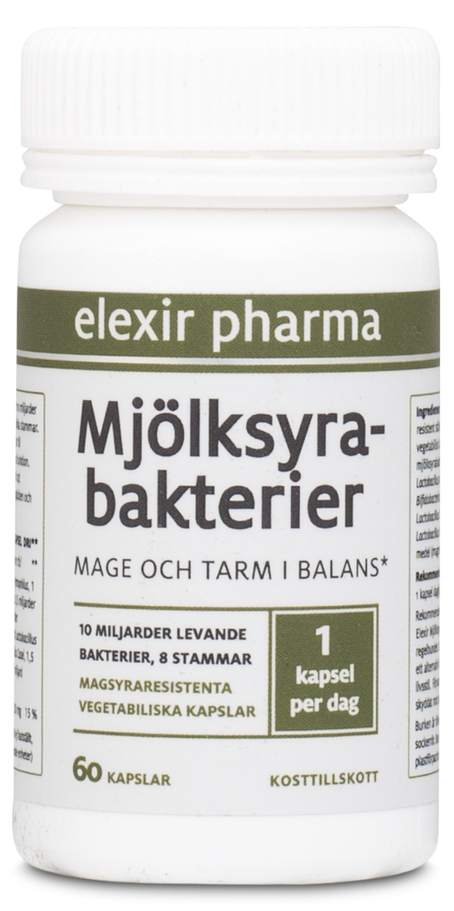 Elexir Pharma Mjölksyrabakterier är kapslar fulla av goda magbakterier. Varje kapsel ger dig 10 miljarder goda mjölksyrabakterier från 8 olika stammar. I tillskottet ingår även det viktiga mineralet kalcium. Mjölksyrabakterier finns naturligt i vår tarmflora där de har en viktig funktion för bland annat immunsystemet. De ligger som ett skydd i tarmen där de motverkar skadliga bakterier. Ibland när vi stressar, äter dåligt eller är sjuka en längre period kan denna balans av goda bakterier rubbas och då kan kapslar med mjölksyrabakterier vara ett bra tillskott. Kapslarna från Elexir Pharma består av syraresistent skal vilket gör att de kan passera magsäcken oskadda.