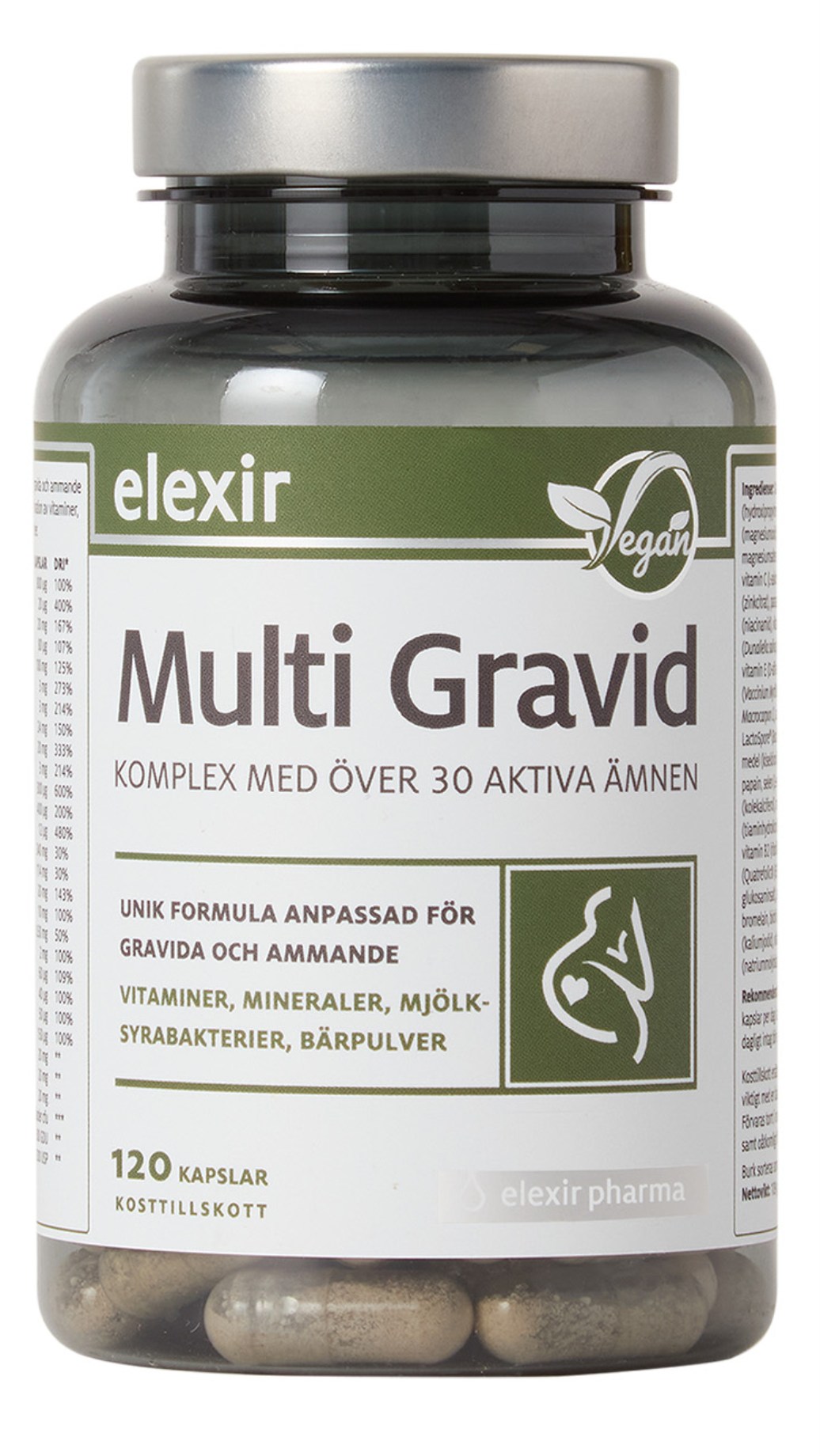 Känn dig trygg under hela graviditeten och amningsperioden med MultiGravid från Elexir Pharma, ett multitillskott med näring från vitaminer, mineraler, bärpulver och enzymer för magen. En allt-i-ett-produkt som hjälper dig på vägen till rätt näring i en av de viktigaste perioderna i livet. Elexir Pharma MultiGravid innehåller samtliga vitaminer och mineraler du behöver i tillräckliga doser för att säkerställa intaget från kosten. Dessutom ingår extra hög halt folsyra och järn som rekommenderas under graviditet. Produkten innehåller metylerad folat (folsyra) som är lätt för kroppen att tillgodogöra sig. Folsyra bidrar till normal fosterutveckling. Järn bidrar till normal blodbildning och syretransport, och ingår i en form som är skonsam mot magen. Dessutom är bärpulver från bland annat blåbär och tranbär tillsatt, för naturlig näring. Även utvalda matsmältningsenzymer och mjölksyrabakterier ingår för magens skull. Använd som ett dagligt tillskott med 2 kapslar per dag.