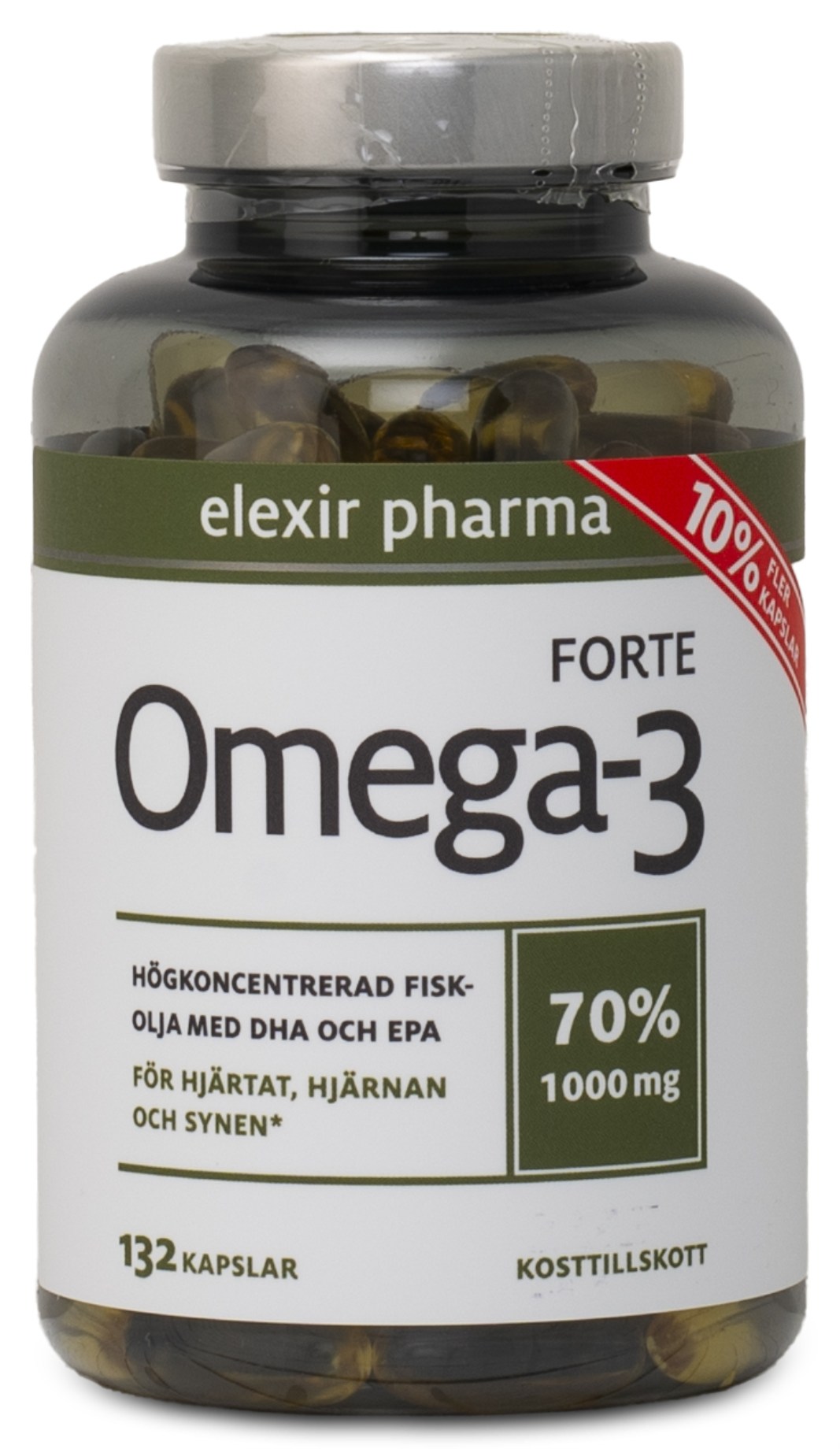 Med Omega-3 Forte från Elexir Pharma förser du din kropp hela 70 % omega-3 per kapsel. Fiskoljan består av naturligt fiskoljekoncentrat och innehåller en hög mängd av de viktiga omega-3 fettsyrorna EPA och DHA i triglyceridform. Båda dessa fettsyror är viktiga för hjärtats normala funktion och DHA bidrar dessutom till normal hjärnfunktion och normal syn. Med Elexir Pharma Omega-3 Forte behövs endast en kapsel per dag räcker för att tillgodose ditt dagliga intag av dessa hälsosamma fettsyror.