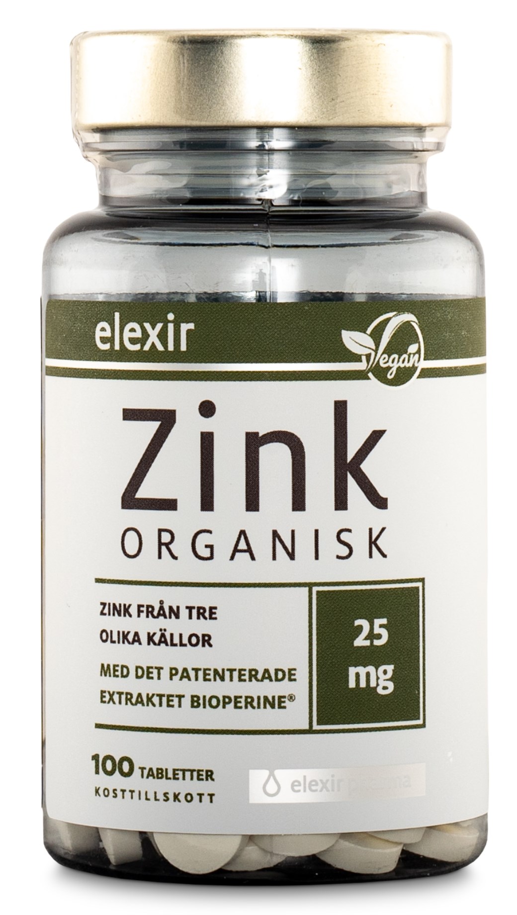 Dessa tabletter från Elexir Pharma innehåller organiskt zink som är bra för bland annat bildandet av benvävnad och omsättning av protein. Elexir Pharma Organisk Zink innehåller dessutom Bioperin® som är en patenterad form av svartpepparextrakt som ökar upptaget. Elexir Pharma Organisk Zink innehåller zink från tre olika källor så som zinkbisglycinat, zinkcitrat och zinksulfat vilket gör att den passar alla åldrar och ger ett heltäckande zinktillskott. Tabletterna är även fria från konserveringsämnen och konstgjorda färg- och smakämnen.