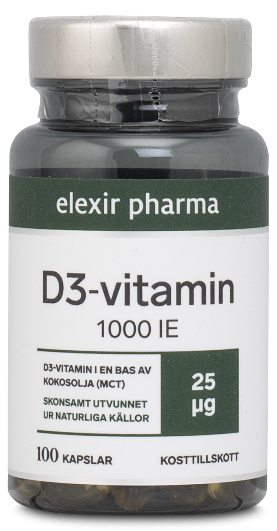 Elexir Pharma Vitamin D3 1000 IE är ett tillskott som innehåller 1000 IE D3 vitamin per kapsel. D-vitaminet har lösts i en bas av kokosolja (MCT-olja). D-vitamin bidrar till bland annat normal muskelfunktion och till immunförsvarets normala funktion. Det hjälper även kroppen att ta upp kalcium. Ett tillskott som är bra speciellt under vinterhalvåret när vi inte får tillräckligt med solljus.