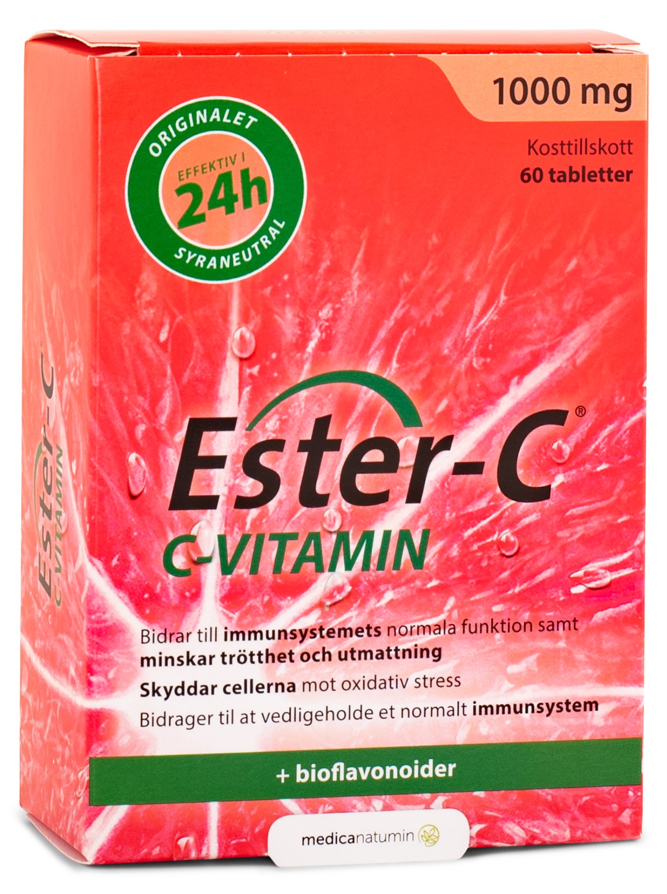 Ester-C innehåller hela 1000 milligram vitamin C i en patenterad variant av kalciumaskorbat. Den speciella sammansättningen gör att upptaget är väldigt snabbt och långvarigt. Dessutom är produkten syraneutralt vilket innebär att den är snäll mot magen. Ester-C är berikad med 200 milligram bioflavoider - ett beprövat kosttillskott som funnits på marknaden i över 25 år.