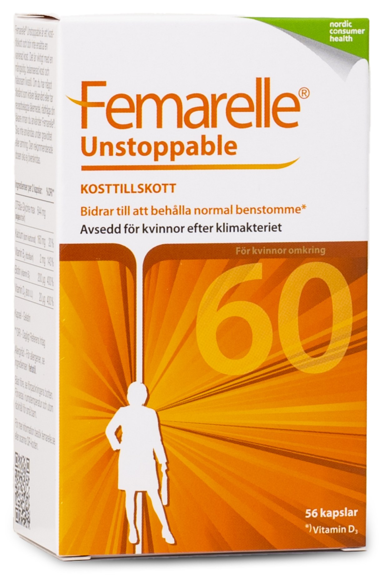 Femarelle Unstoppable är framtaget för kvinnor i 60-årsåldern som passerat övergångsåldern. De låga östrogennivåerna som kommer efter klimakteriet kan bland annat bidra till ett skörare skelett, torra och sköra slemhinnor i underlivet samt minskad energi. Femarelle Unstoppable innehåller vetenskapligt dokumenterade ingredienser för dig som vill bibehålla ett aktivt liv med normal benhälsa samt normala slemhinnor i underlivet. I innehållet finns bland annat kalcium som bidrar till att upprätthålla ett normalt skelett samt biotin som bidrar till bibehållandet av normala slemhinnor.