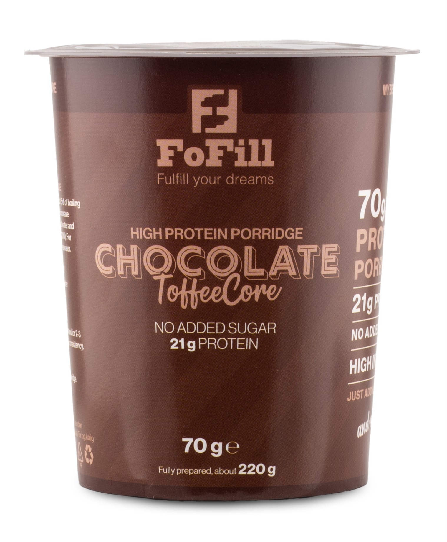 Havregryn och vassle utgör grunden i FoFill och de olika smakerna framhävs med hjälp av naturliga ingredienser såsom kakao, vanilj och äppelbitar. Ta med dig en FoFill Meal i väskan och du kommer alltid ha en varm måltid till hands när det är dags att njuta av något gott och proteinrikt.