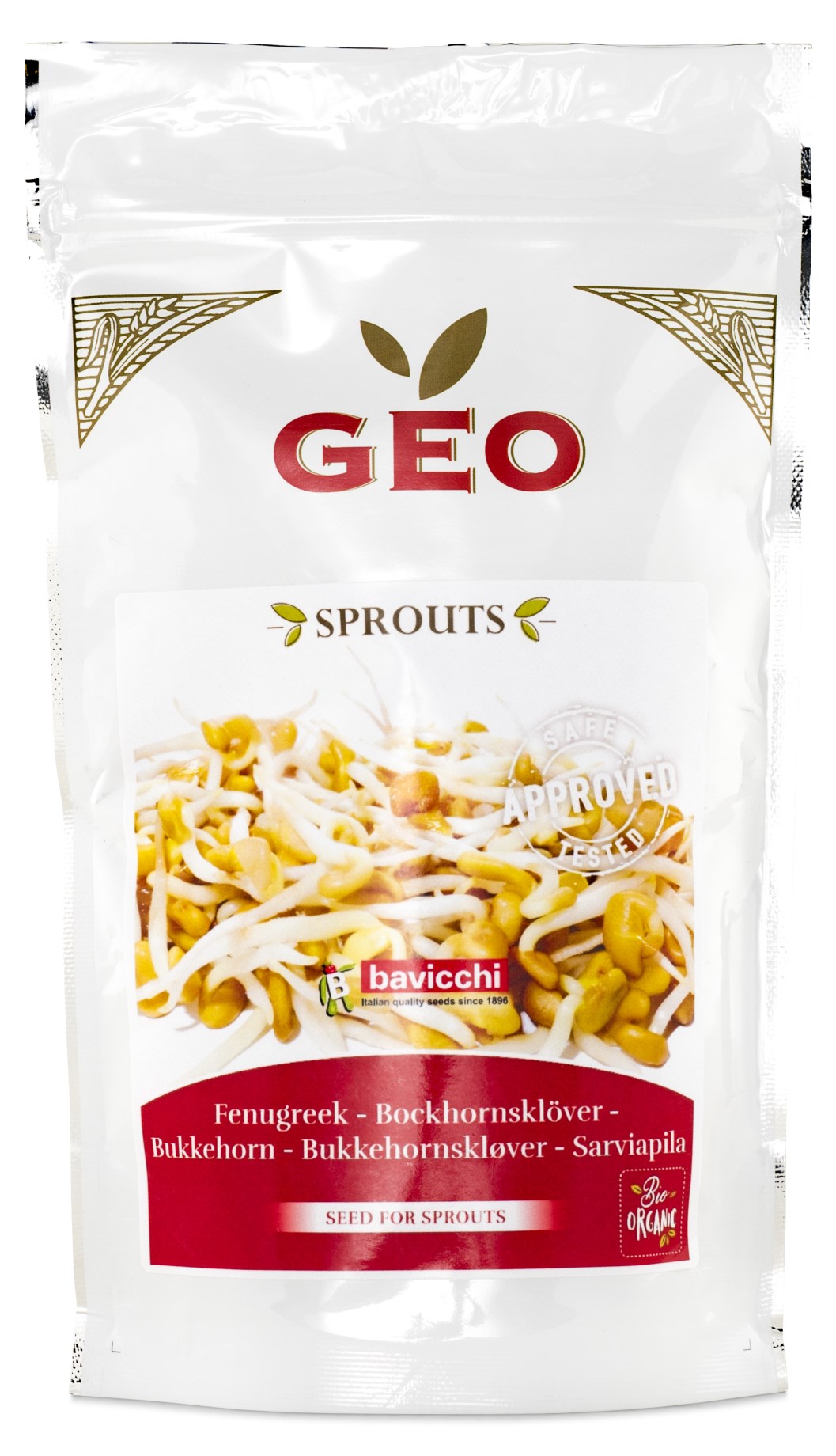 GEO Bockhornsklöverfrö EKO är groddfrön av det orientaliska fröet bockhornsklöver. Bockhornsklöver är en viktigt ingrediens som krydda i curry, men kan även groddas för att få kryddiga och näringsrika groddar. Groddarna är mycket rika på protein (23 %) samt mineraler som magnesium, kalcium, zink och järn. De anses även vara välgörande för matsmältningen.