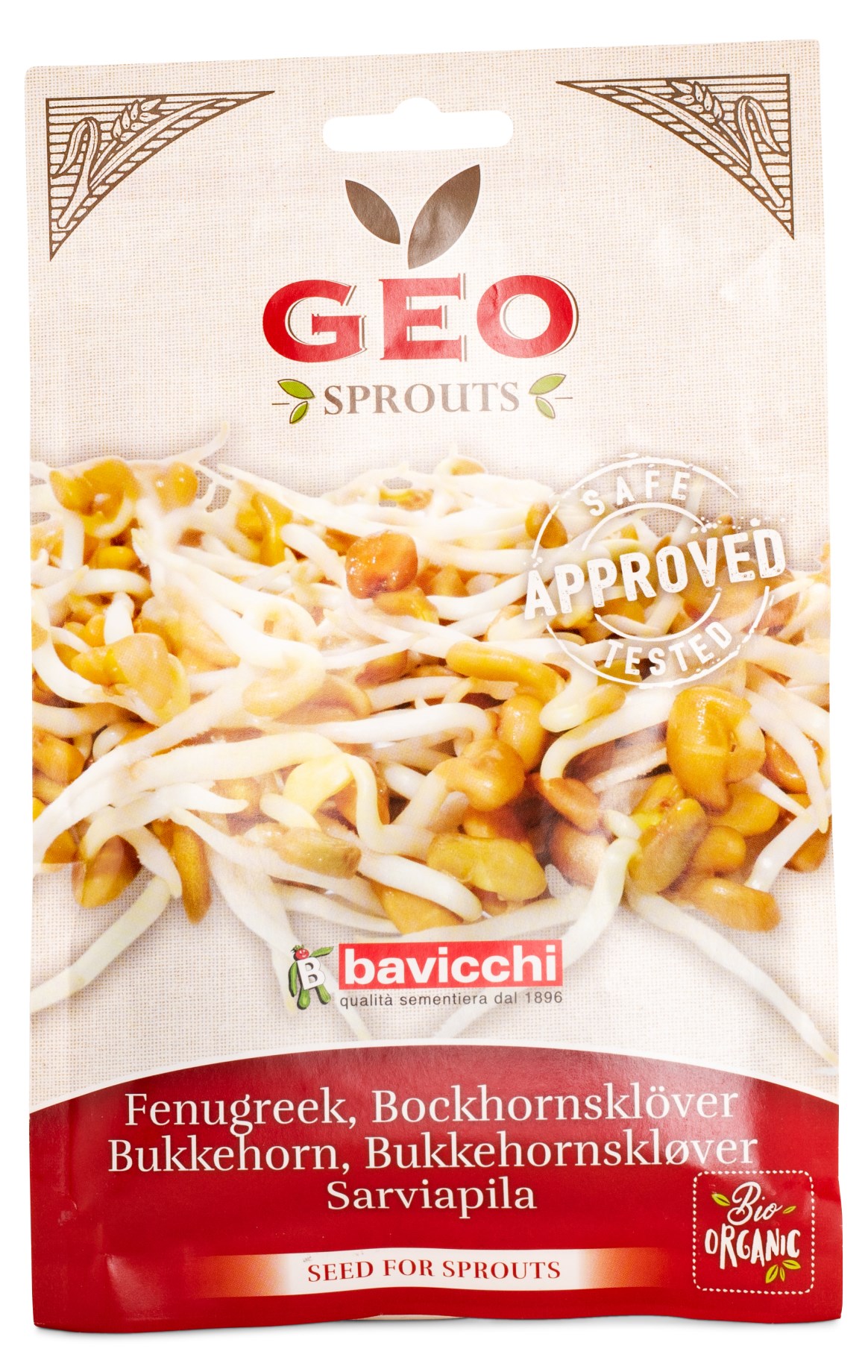 GEO Bockhornsklöverfrö EKO är groddfrön av det orientaliska fröet bockhornsklöver. Bockhornsklöver är en viktigt ingrediens som krydda i curry, men kan även groddas för att få kryddiga och näringsrika groddar. Groddarna är mycket rika på protein (23 %) samt mineraler som magnesium, kalcium, zink och järn. De anses även vara välgörande för matsmältningen.