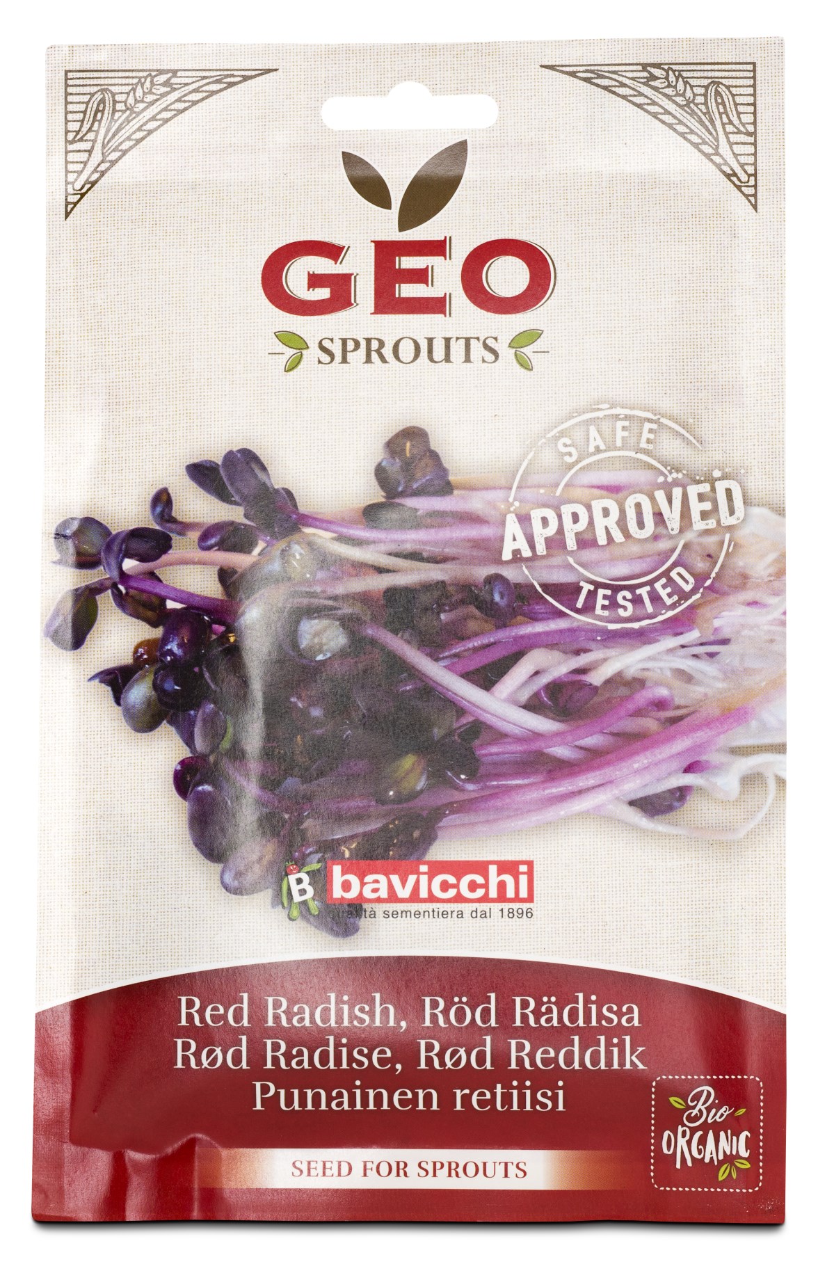 GEO Röda Rädisfrön EKO ger krispiga, kryddiga groddar med tydlig smak av rädisa. Groddarna gror inom några dagar och kan sedan användas för att göra en sallad mer spännande eller kanske ätas som ett gott tilltugg. Groddarna får en spännande lila färg och innehåller rikligt med både vitaminer och mineraler. GEO Röda Rädisfrön EKO har en mer intensiv smak än exempelvis rosa rädisa och är enkla att grodda på några dagar.