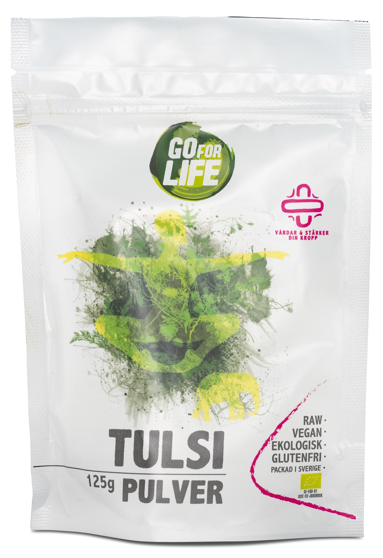 Go for Life Tulsipulver EKO är ett ekologiskt pulver gjort på den nyttiga örten tulsi. Tulsi är rik på antioxidanter och innehåller A-, C- och K-vitamin, kalcium och järn. Då tulsi är fritt från koffein som piggar upp blir det perfekt att brygga te på tulsi och exempelvis dricka det som ett avslappnande kvällste. Man kan även inta pulvret genom att blanda i det i smoothies eller juicer, för en riktig vitaminboost.
