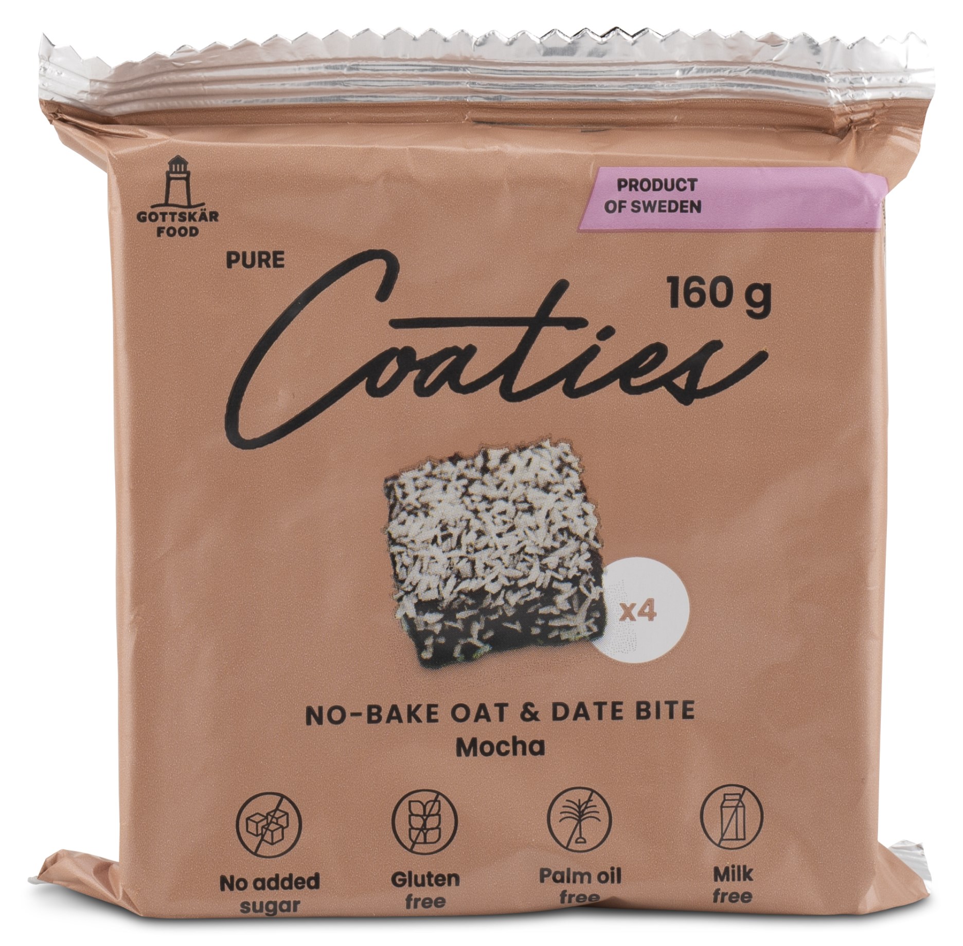 Coaties från Gottskär Food AB är veganska, glutenfria och mjölkfria havretärningar utan tillsatt socker. Dessa godsaker kommer i flera härliga smaker och innehåller alla dadelmassa och glutenfri havre, tillsammans med andra nyttiga ingredienser och naturliga aromer. Perfekt som ett hälsosammare alternativ till fikat!