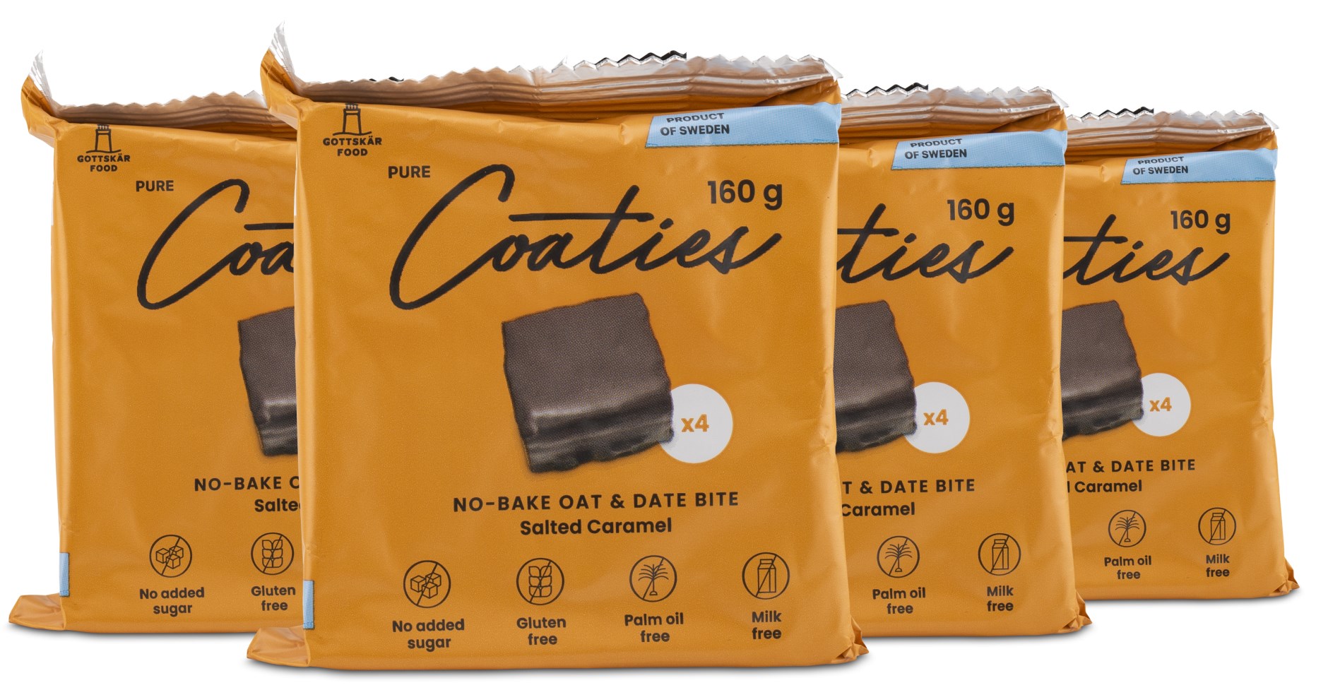 Coaties från Gottskär Food AB är veganska, glutenfria och mjölkfria havretärningar utan tillsatt socker. Dessa godsaker kommer i flera härliga smaker och innehåller alla dadelmassa och glutenfri havre, tillsammans med andra nyttiga ingredienser och naturliga aromer. Perfekt som ett hälsosammare alternativ till fikat!