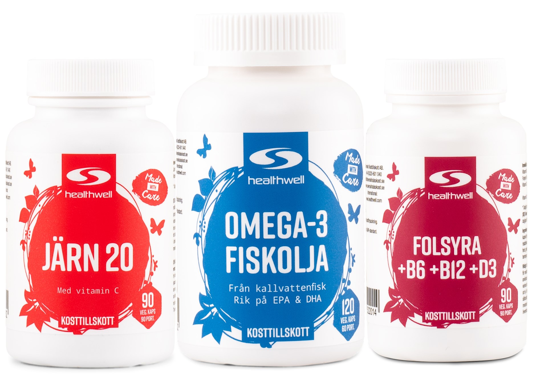 Folsyra – folsyra bidrar till fostrets normala utveckling och är därför extra viktigt under de tre första månaderna av graviditeten. I gravidpaketet ingår Healthwell Folsyra+B6+B12+D, alltså folsyrakapslar med tillsatta B-vitaminer och D-vitamin.