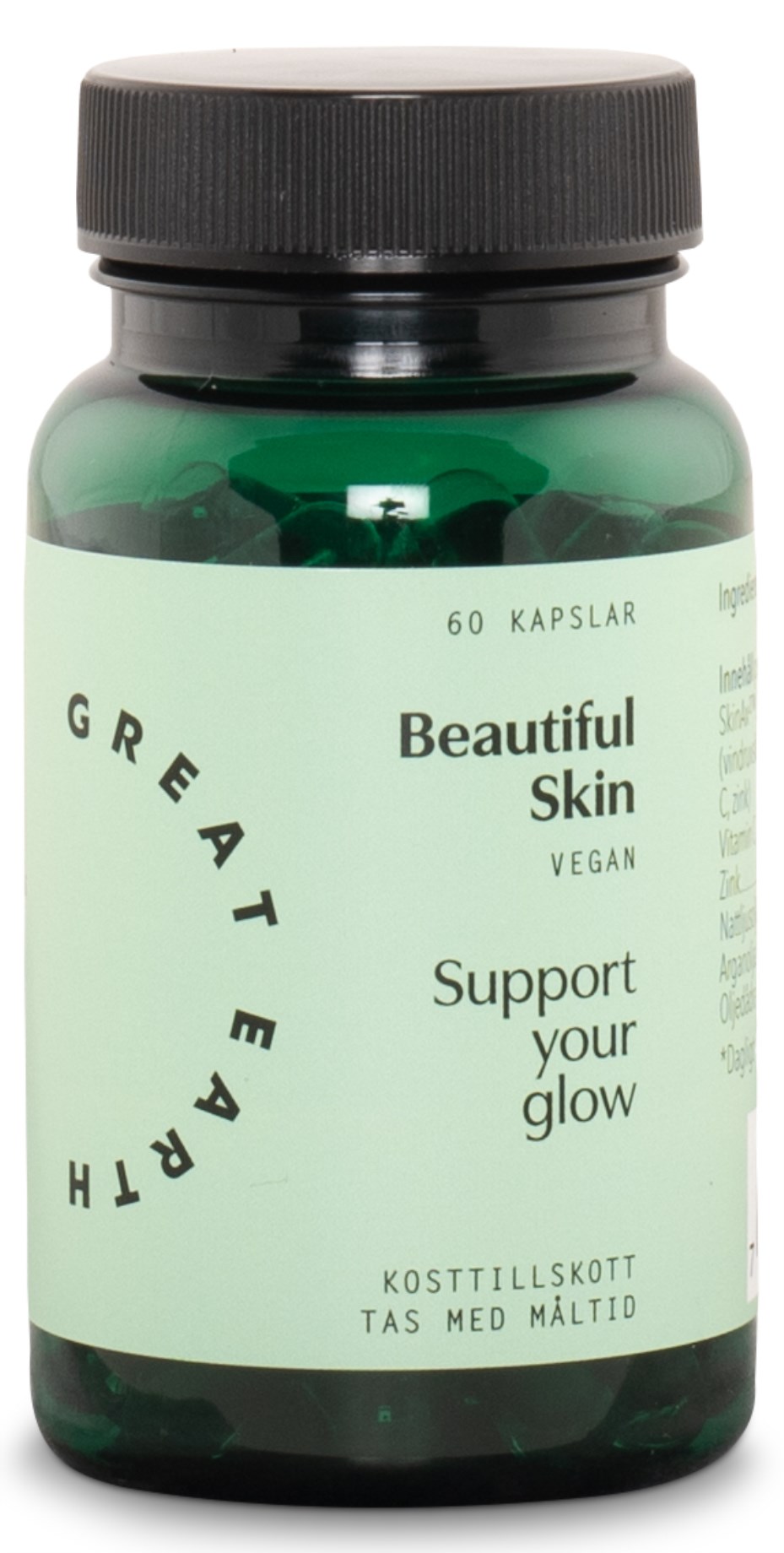 Great Earth Beautiful Skin är ett tillskott som bidrar till att upprätthålla normal hy. Tillskottet är unikt med sin DuoCap, en kapsel i kapseln där den yttre kapseln består av de tre oljorna arganolja, nattljusolja och gold of pleasure oil (oljedådra). Dessa oljor skapar en balans av essentiella fettsyror som ger näring till huden. Den inre kapseln består av det patenterade extraktet SkinAx2 som består av champagnedruva och fransk melon, samt vitamin C och zink som skyddar cellerna.