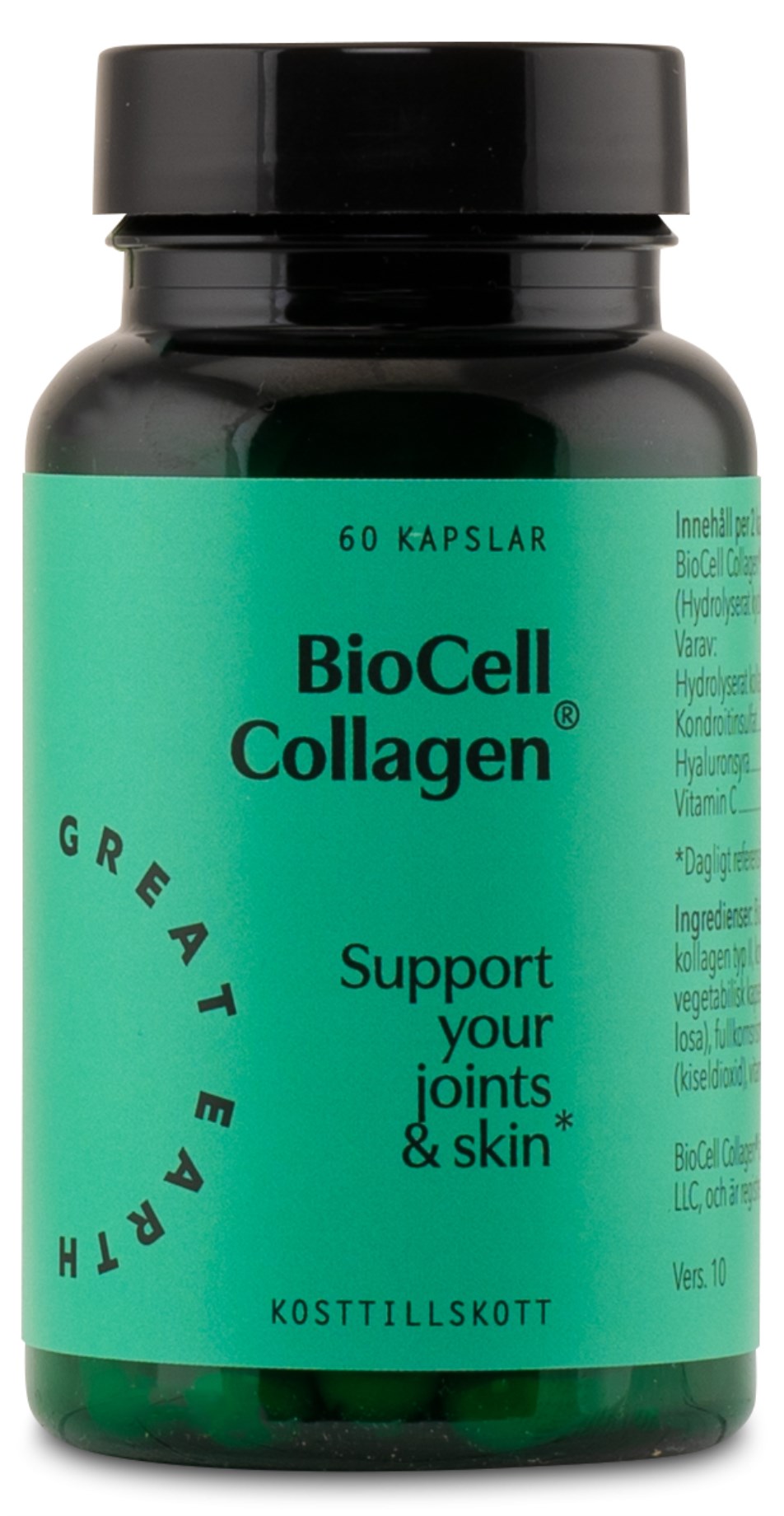 Great Earths kosttillskott BioCell Collagen är noggrant sammansatt med kollagen typ II, kondroitin och hyaluronsyra. Dessa naturliga ämnen finns naturligt i kroppens brosk och spelar en viktig roll för lederna, huden och bindväven. BioCell Collagen tillverkas genom en patenterad process som säkerställer snabb och effektiv absorption i kroppen. Kapslarna är också berikade med vitamin C för att främja kollagenproduktionen. De aktiva ingredienserna i produkten utvinns från kycklingbrosk, vilket har en liknande struktur som mänskligt ledbrosk och därmed lätt tas upp av kroppen. Extraktet framställs från kycklingar som inte har behandlats med hormoner eller antibiotika, för att säkerställa produktens renhet och höga kvalitet.