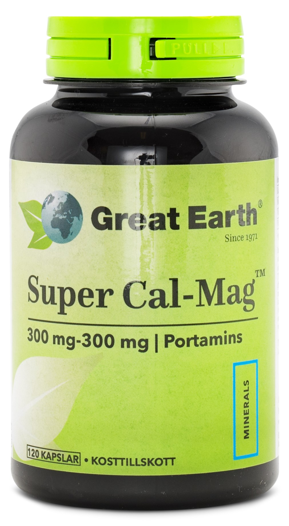 Super Cal-Mag från Great Earth är ett kalcium- och magnesiumtillskott med 300 mg vardera av dessa mineraler. De två nödvändiga mineralerna är viktiga för skelett och tänder samt för kroppens normala muskel- och ledfunktioner. Magnesium som bidrar till minskad trötthet och utmattning men även till musklernas avslappningsförmåga. Cirka 99% av kroppens kalcium återfinns i skelett och tänder och för såväl uppbyggnad som reparation av dessa är kalcium den viktigaste byggstenen. Då kroppen behöver magnesium för att kunna ta upp kalcium är detta ett tillskott som gynnar de båda mineralerna. Great Earth Super Cal-Mag är dessutom berikat med vitamin D3 och vitamin K2 som i sin tur bidrar till reglering av kalcium och en normal bentäthet och benstomme.