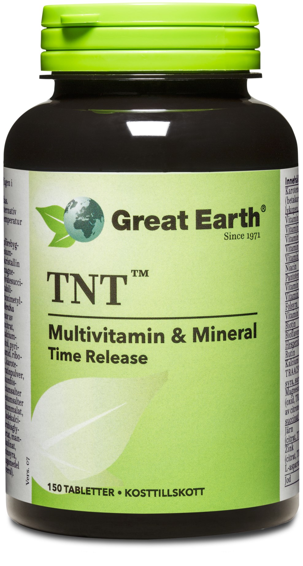 Ett bra multivitamin ska innehålla ett brett spektrum av vitaminer och mineraler i lättupptagbar form. TNT från Great Earth är en sådan multivitamin med en balanserad mängd av näringsämnen samt tillsatta matsmältningsenzymer och lipotroper. Tabletterna har en tidsutsöndrande effekt vilket innebär att de tas upp av kroppen under en längre tid med jämn tillförsel. Rekommenderad dosering är 1-2 tabletter dagligen, tillsammans med måltid.