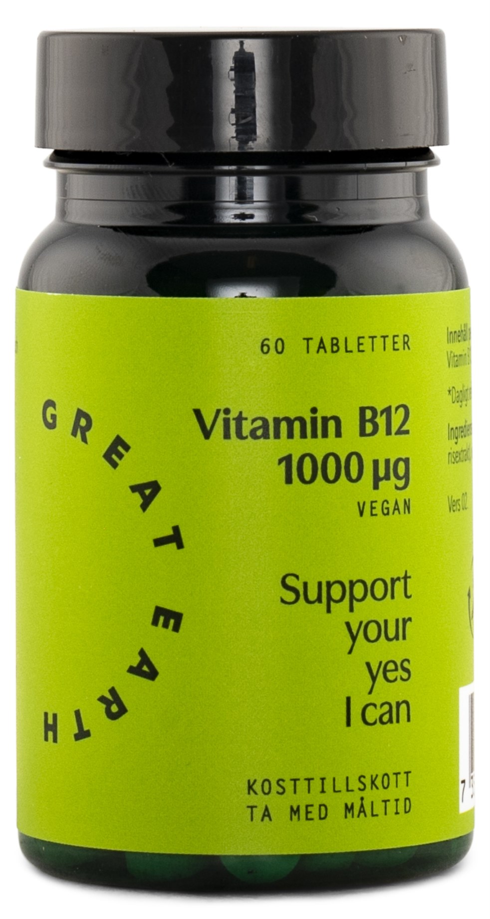 Great Earth Vitamin B12 1000 mcg Vegan är speciellt utvecklad för dig som har svårt att få i dig vitamin B12 via kosten. Vitamin B12 finns nästan enbart i animaliska produkter som fisk, kött och ägg. Det kan därför vara extra svårt för dig som är vegan, vegetarian eller äter en begränsad kost att få i dig B12. Great Earth Vitamin B12 Vegan innehåller metylkobalamin som är en syntetisk form av vitamin B12. Denna form av vitaminen är lätt för kroppen att ta upp och tillgodogöra sig. En portion om dagen räcker och innehåller 1000 mcg B12.