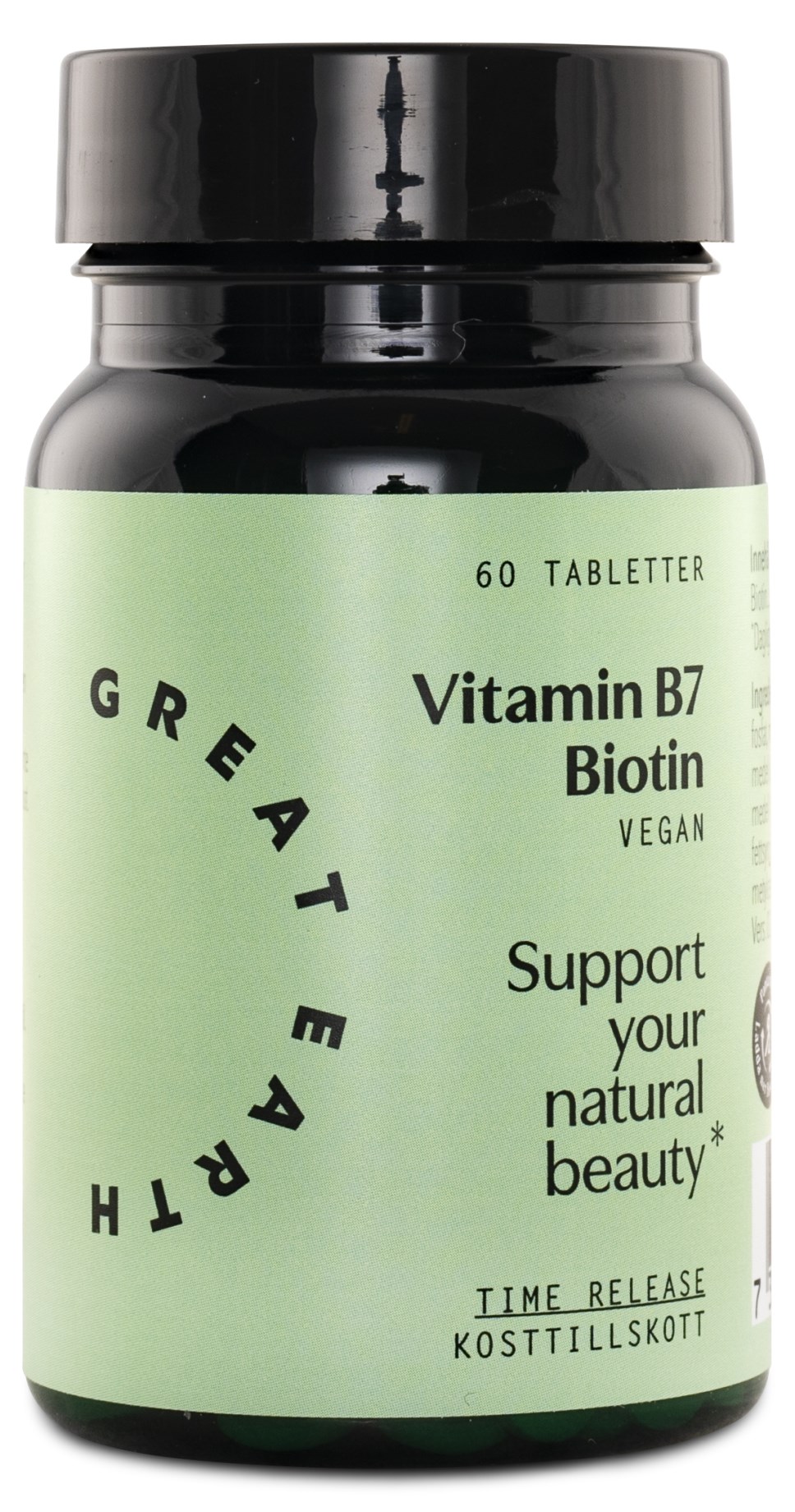 Great Earth Vitamin B7 är ett högdoserat kosttillskott med biotin som bidrar till att bibehålla normal hud och bibehållandet av normalt hår. Biotin bidrar även till nervsystemets normala funktion och till normal omsättning av makronäringsämnen. Great Earth Vitamin B7 utsöndras gradvis i kroppen vilket innebär att det vattenlösliga vitaminet behålls i kroppen under flera timmar.