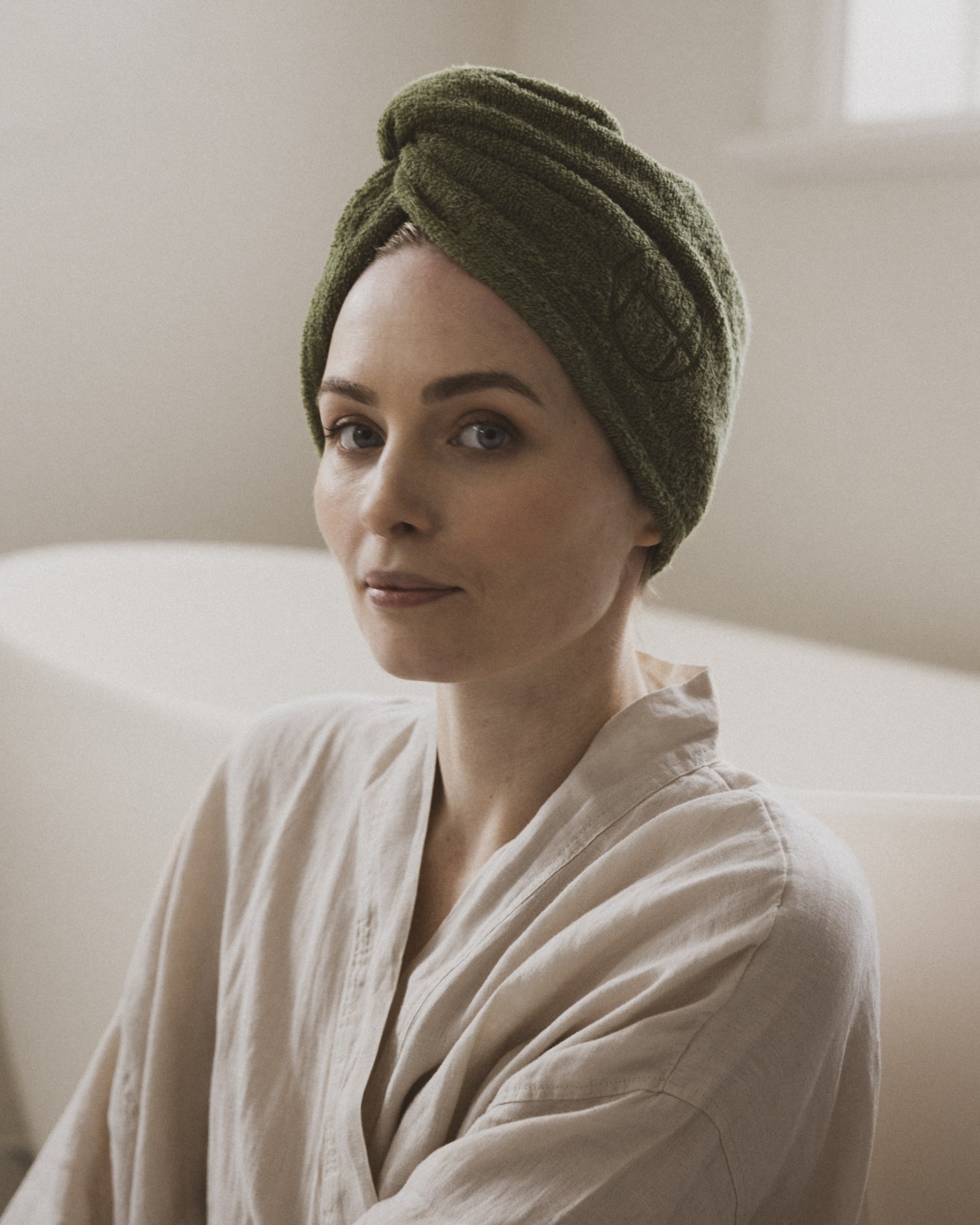 Vira in ditt nytvättade hår i Green Heads Hair Towel Wrap, en lyxig hårhandduk i 100 % ekocertifierad bomullsfrotté. Denna handduk är utformad som en turban, för att passa huvudet. Genom att vira handduken och fästa den med en knapp i nacken sitter den stadigt och förhindrar att ditt hår slits. Handduken absorberar överflödigt vatten och hjälper håret att torka snabbare för ett glänsande mjukt resultat utan friss. Handduksturbanen är även utmärkt att använda för hårinpackning. Använd den direkt på håret, men kom ihåg att tvätta den efteråt, eller sätt en plastpåse över håret innan du virar turbanen runt för extra skydd.