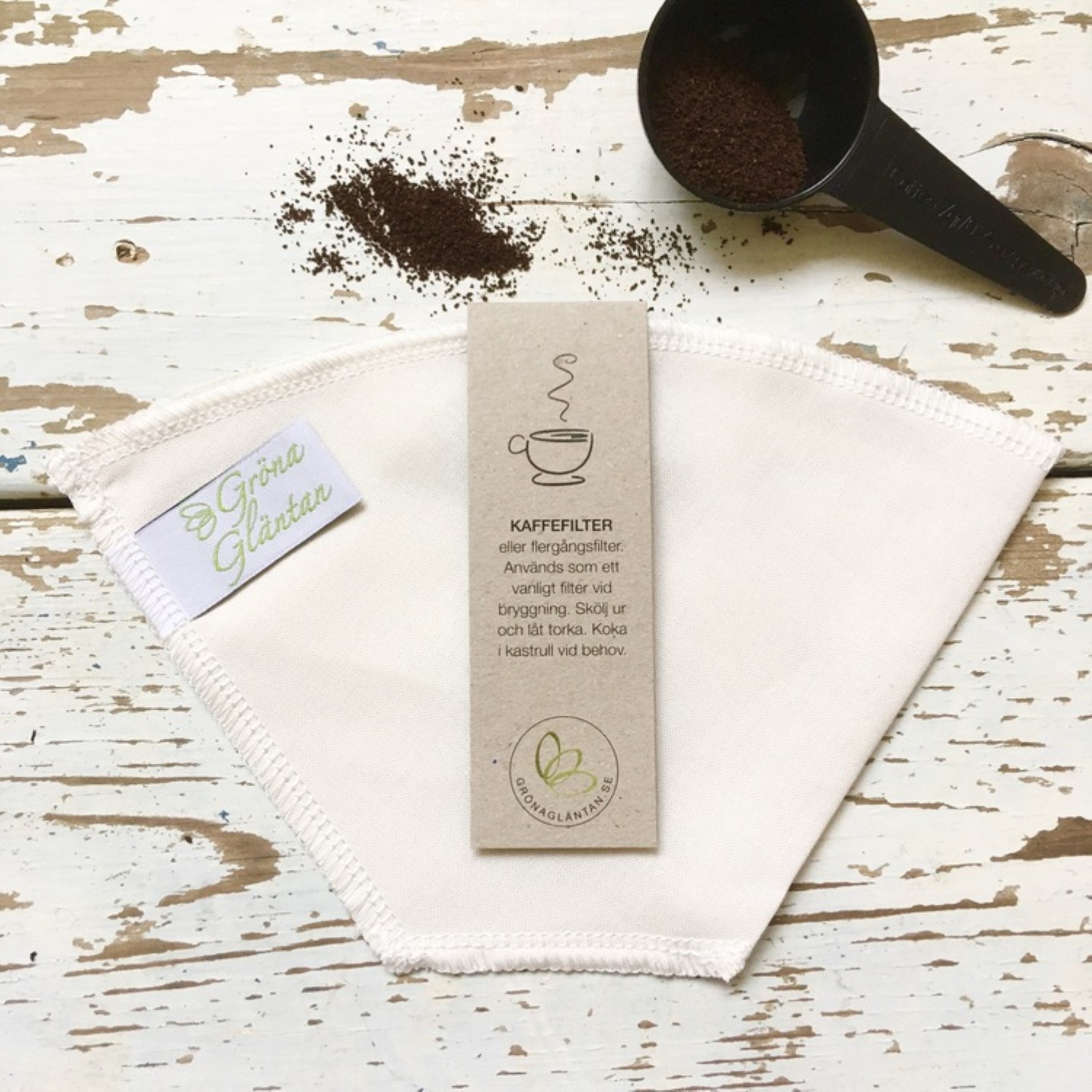 Gröna Gläntan Kaffefilter i tyg är ett kaffefilter i GOTS-certifierad bomull. Detta kaffefilter är ett hållbarare alternativ till vanliga engångsfilter eftersom du kan tvätta och använda det om och om igen - bra både för miljön och plånboken! För att rengöra filtret kan du antingen koka det i vatten någon minut, eller tvätta i tvättmaskin i 40 grader utan tvätt- eller sköljmedel.