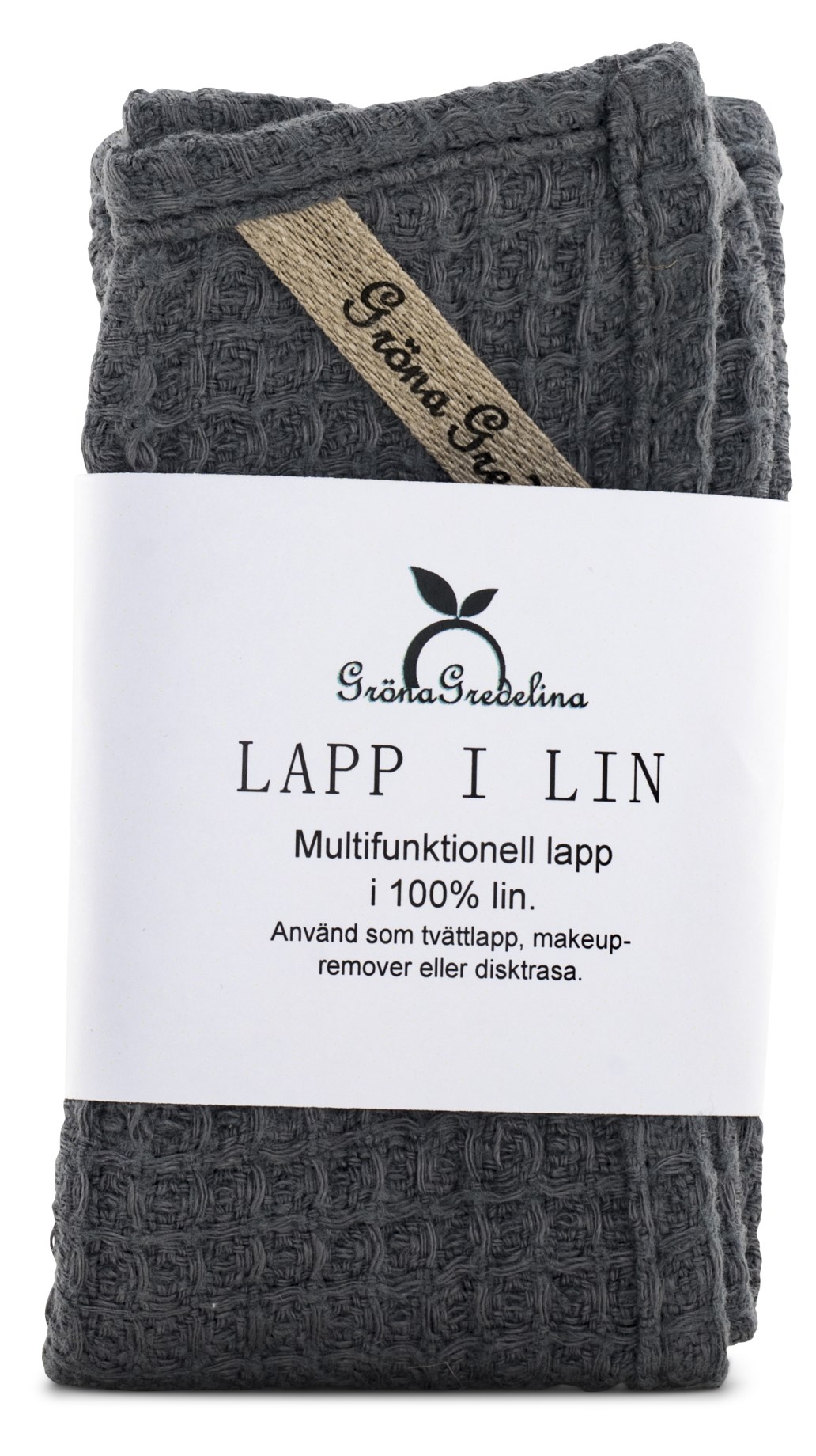 Gröna Gredelina Lapp i Lin är en virkad lapp i 100 % linne som du kan använda som disktrasa eller diskduk. Trasan torkar snabbt och går att tvätta och återanvända, du slipper slit och släng. Det fungerar även bra som tvättlapp till barn eller till ditt ansikte för exempelvis sminkborttagning.