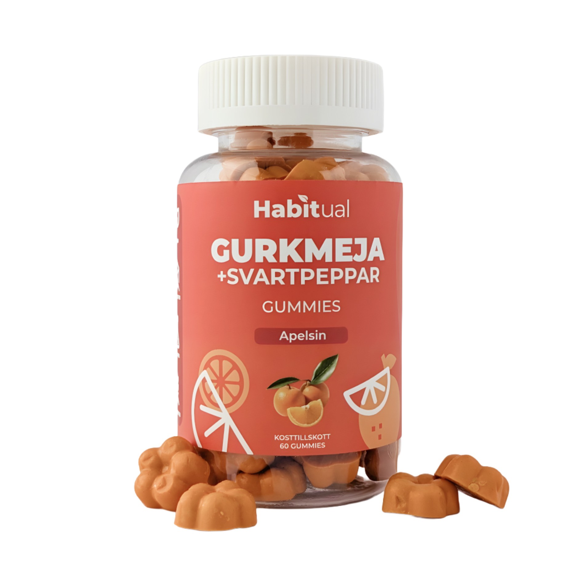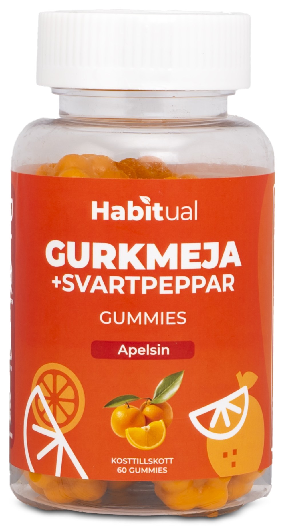 Gurkmeja Gummies + Svartpeppar från Habitual är fruktiga gummies med gurkmeja (curcumin), ingefära och svartpeppar. Naturligt, veganskt och glutenfritt, med god smak av apelsin, utan bitter eftersmak. En portion ger 300 mg gurkmeja. Perfekt när du vill ha ett gott, enkelt och smidigt sätt att ta del av gurkmejans fördelar!