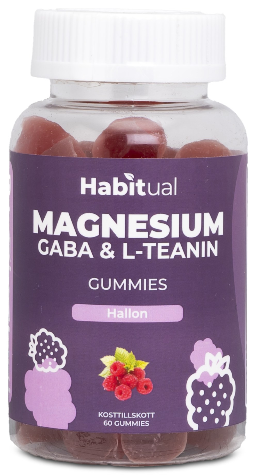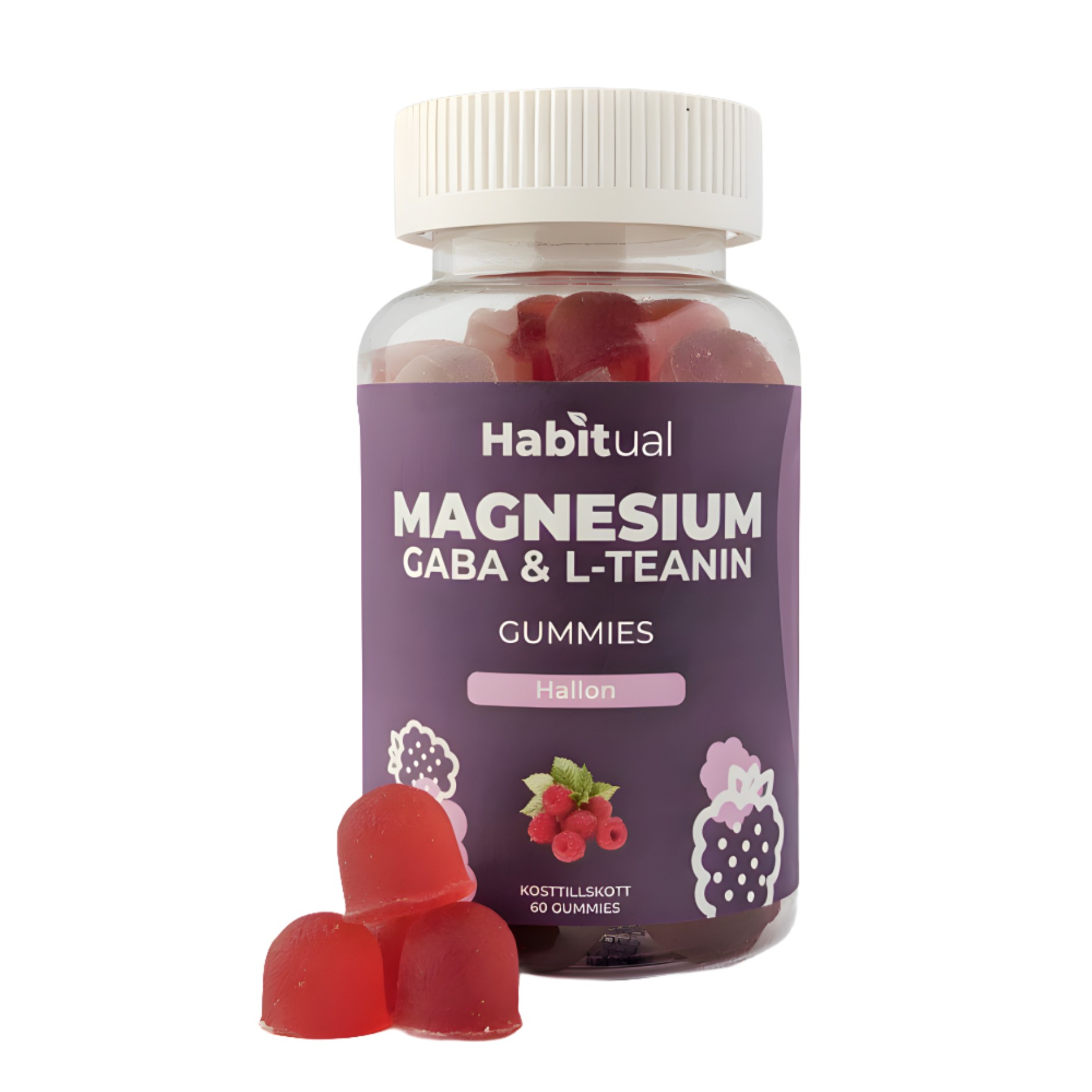 Njut av hallonsmakande gummies före sänggåendet. I Habitual Magnesium m L-teanin & Gaba Gummies får du magnesium, L-teanin och GABA i form av välsmakande gummies. Med kamomill som traditionellt har använts för lugnare nattsömn. Två gummies före sänggåendet räcker. Sockerfria.