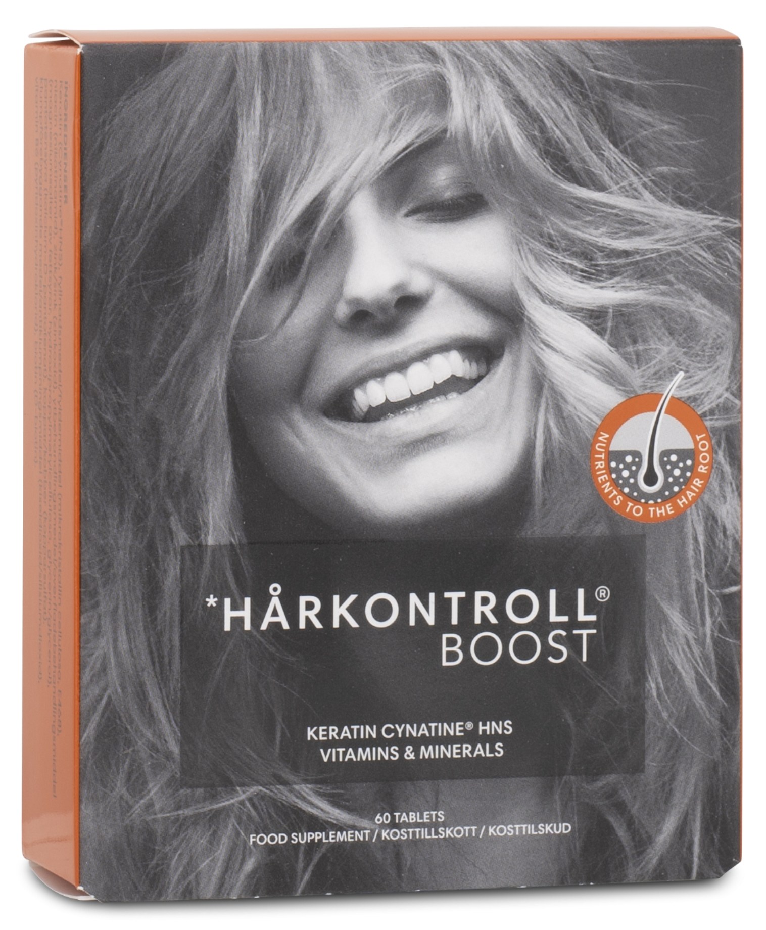 Med Hårkontroll Boost ger du det där lilla extra till hud, hår och naglar! Tillskottet tillför näring inifrån och ut för ett vackert glänsande och starkt hårsvall samt starka naglar. Med ett innehåll av bland annat det patenterade och kliniskt dokumenterade keratinet Cynatine® HNS, biotin, selen och zink bibehåller hud, hår och naglar sina normala egenskaper. Hårkontroll Boost är ett utmärkt komplement till din vanliga kost för perioder då man vill tillföra lite extra näring.