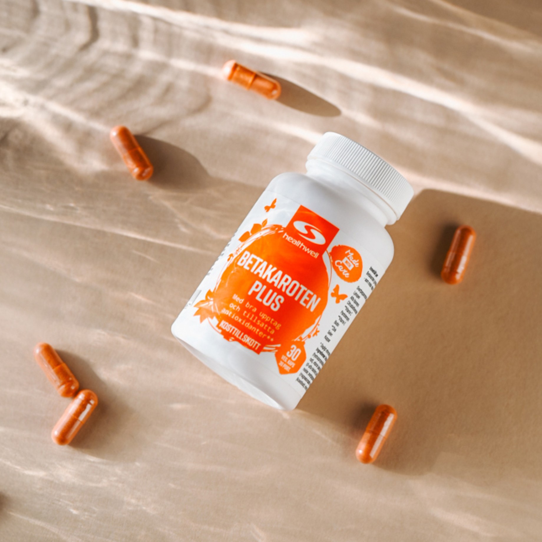 Healthwell Betakaroten Plus är något alldeles extra för solälskaren! Förutom att den är mycket högdoserad med 50 milligram betakaroten (76 000 IE) per dos, är den dessutom förstärkt med svartpepparextrakt och MCT-olja som främjar upptagningsförmågan. Vitamin C och E ingår som skyddande antioxidanter och motverka den oxidativa processen i kroppen. En kapsel om dagen räcker, och börja gärna ditt intag i god tid före solexponering för ännu bättre effekt. Förbered dig inför solsäsongen med Betakaroten Plus!