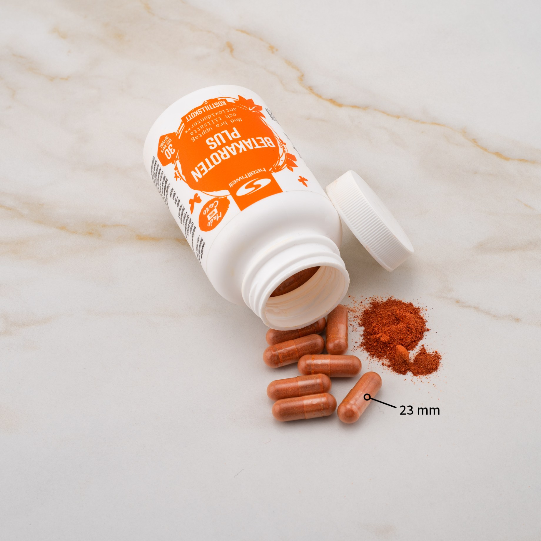 Betakaroten Plus är berikad med lykopen, vitaminer och mineraler. Bland annat ingår vitamin C och E som fungerar som skyddande antioxidanter. Även pantotensyra, biotin, zink och selen finns med bland ingredienserna. När vi utsätts för mycket solning påskyndas den oxidativa processen i kroppen, vilket innebär att cellerna åldras i förtid. Genom att inta mer antioxidanter kan denna process motverkas. Betakaroten Plus kommer i små, lättsvalda och vegetabiliska kapslar. Rekommenderad dosering är en kapsel om dagen tillsammans med ett glas vatten.