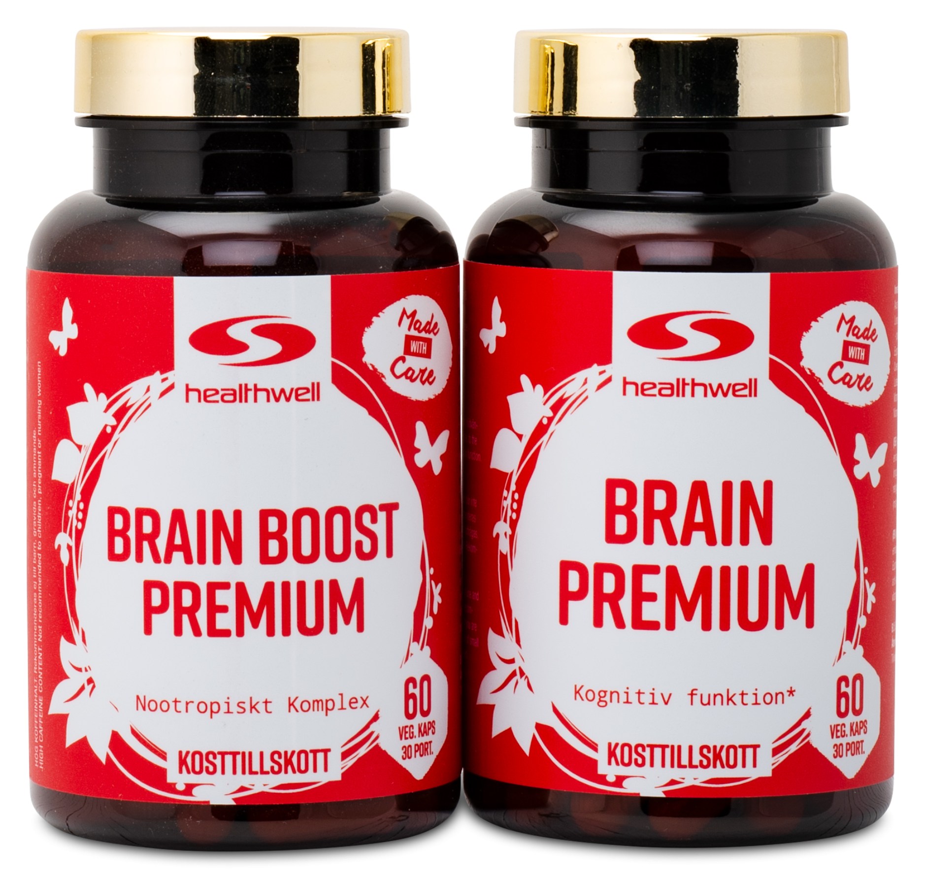 Healthwell Brain Premium och Healthwell Brain Boost Premium är högdoserade kosttillskott för din mentala prestation och hjärna, med fokus på både kortsiktig och långsiktig kognitiv förmåga. Healthwell Brain Premium innehåller ett kraftfullt komplex som är anpassat för att upprätthålla och stödja den mentala funktionen över tid. Komplexet består bland annat av ALC, Euphoria longana-extrakt och Q10. Det innehåller även vitamin B12 och B6 som bidrar till normal psykologisk funktion. Läs mer om Healthwell Brain Premium.