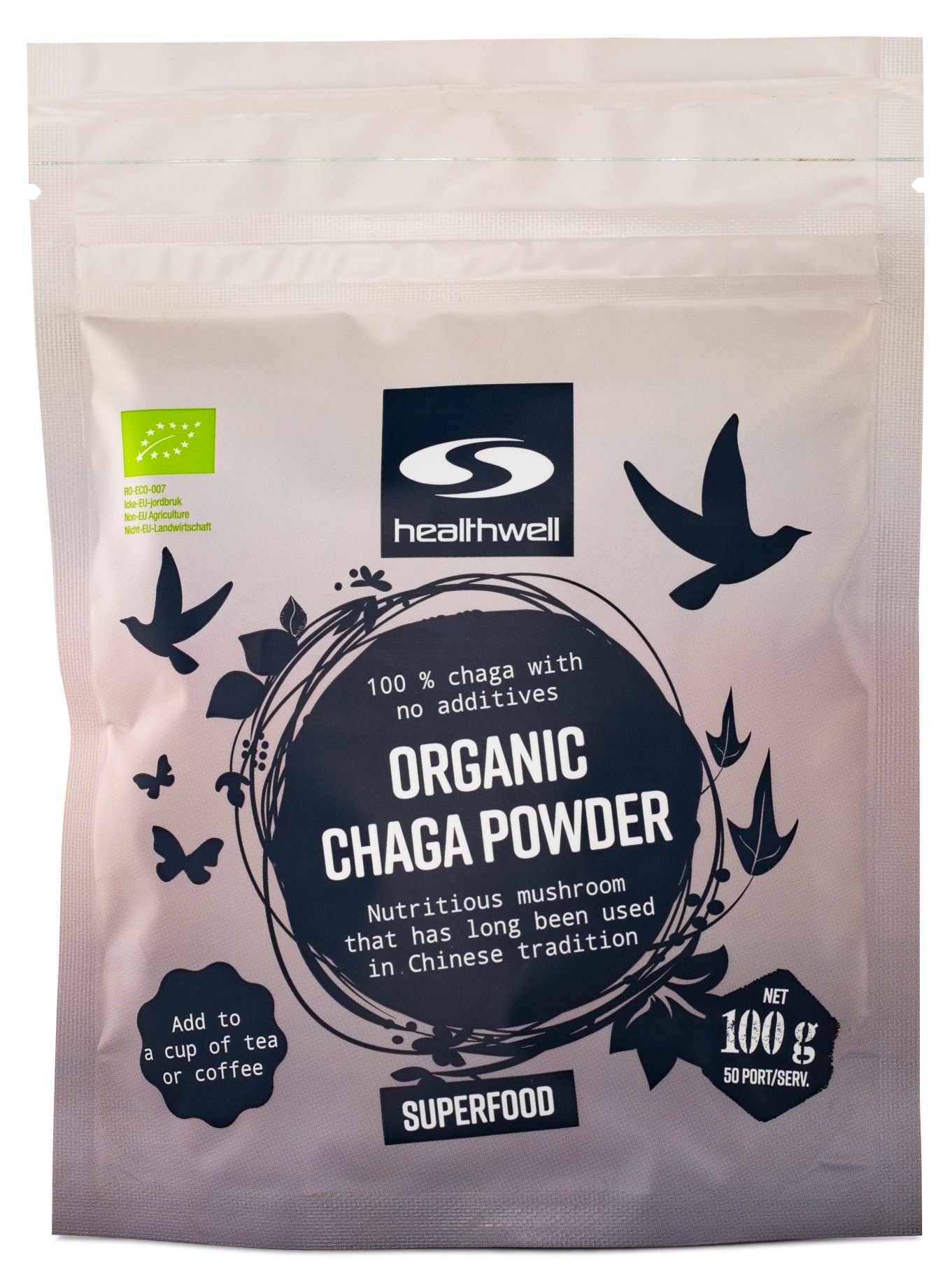 Healthwell Chaga EKO är ett pulver med mild smak från svampen chaga (Inonotus obliquus), även kallad sprängticka på svenska. Chaga har ett mycket högt ORAC-värde (antioxidanter) samt mineraler och vitaminer. Du kan enkelt blanda chagapulvret i varm dryck och dricka som te.