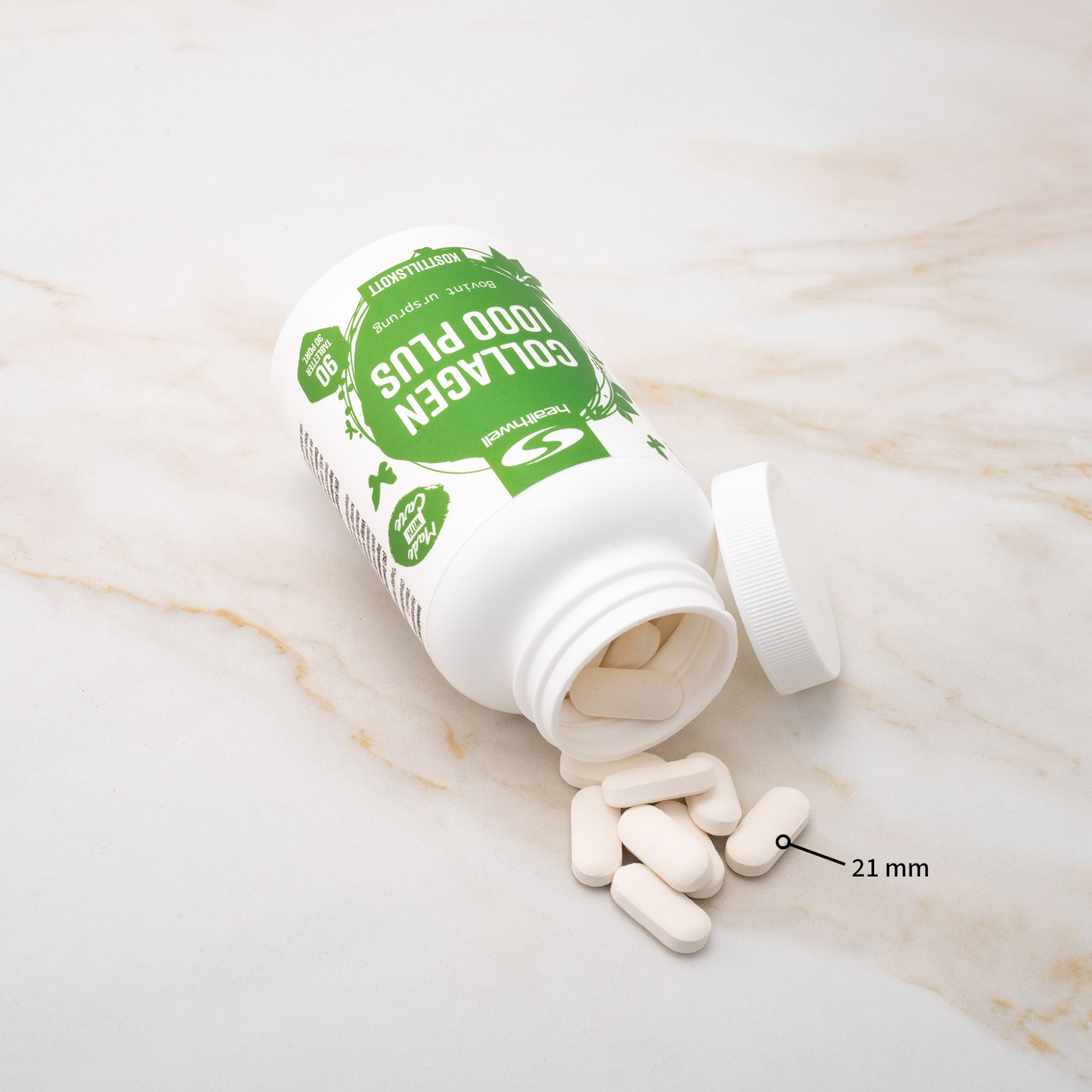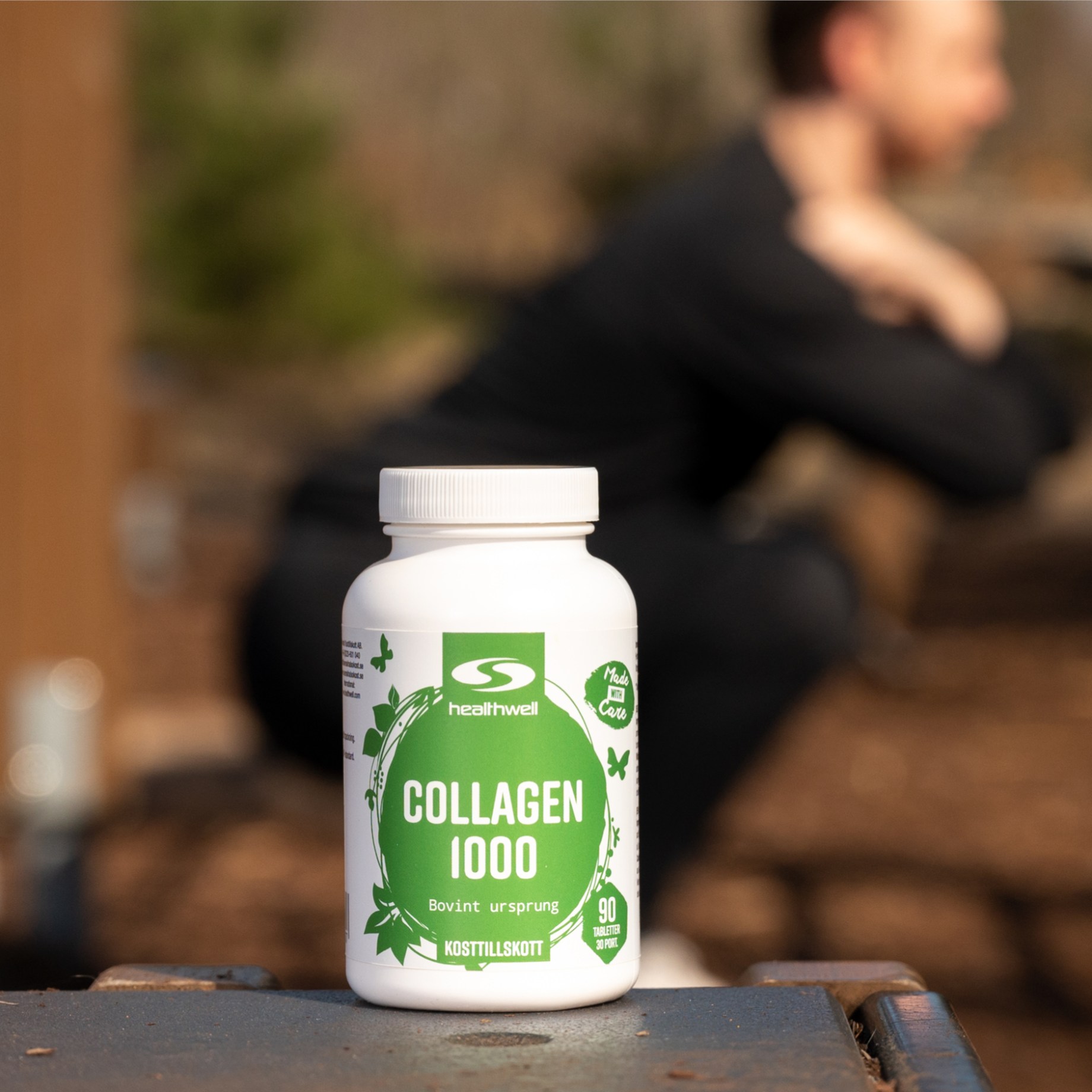Healthwell Collagen 1000 Plus innehåller 1000 mg kollagen av bovint ursprung per tablett och är även berikat med vitamin C, som har många viktiga funktioner i kroppen. Vitamin C fungerar bland annat som en antioxidant och skyddar cellerna från nedbrytning orsakad av fria radikaler, och bidrar även till att upprätthålla ett normalt immunsystem. Vitamin C har också en viktig roll i produktionen av kollagen i kroppen, vilket gör vitaminet extra intressant i kollagentillskott.