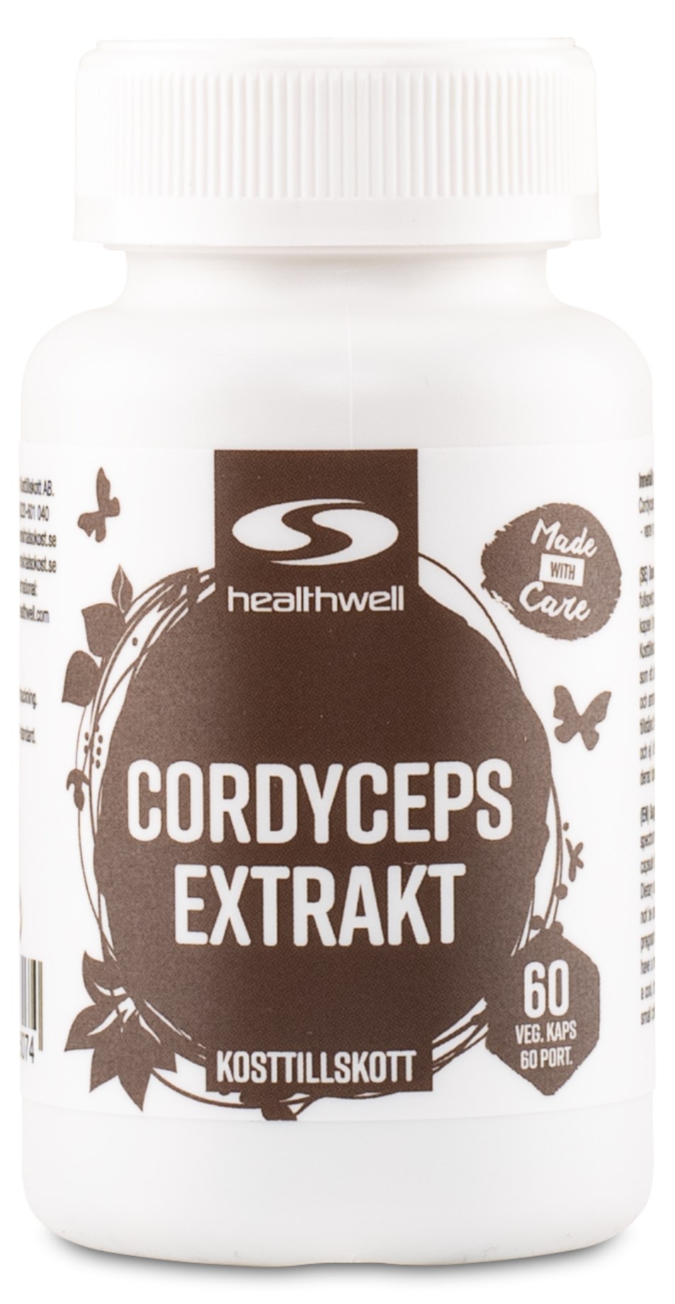 Healthwell Cordyceps Extrakt innehåller ett fullspektrum extrakt av den kinesiska svampen cordyceps, med en optimal mängd aktiva ämnen. Cordyceps är en välkänd svamp inom den kinesiska traditionen av naturmedel, med många tillskrivna positiva egenskaper. Rekommenderad dosering är 1 kapsel per dag, där en dos ger 500 mg cordycepsextrakt.